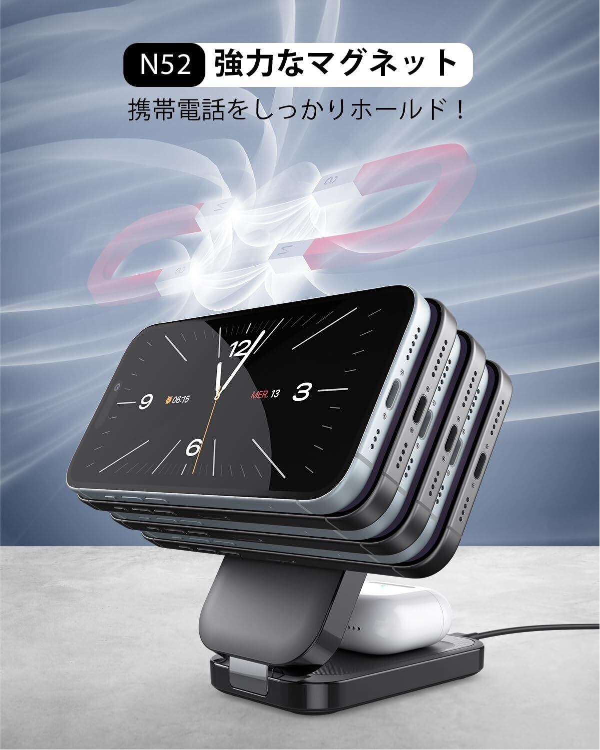 TEPNICAL 3in1 magsafe充電器 折り畳み式 超コンパクト ワイヤレス充電器 高速充電 2.5-10W出力 スタンド iPhone 16/15/14/13/12シリーズ/Airpods 2/3/pro/Apple Watchに対応 軽量 出張/旅行用 マグネット充電器 20WQC3.0アダプタ付属 日本語取扱書付き ブラック