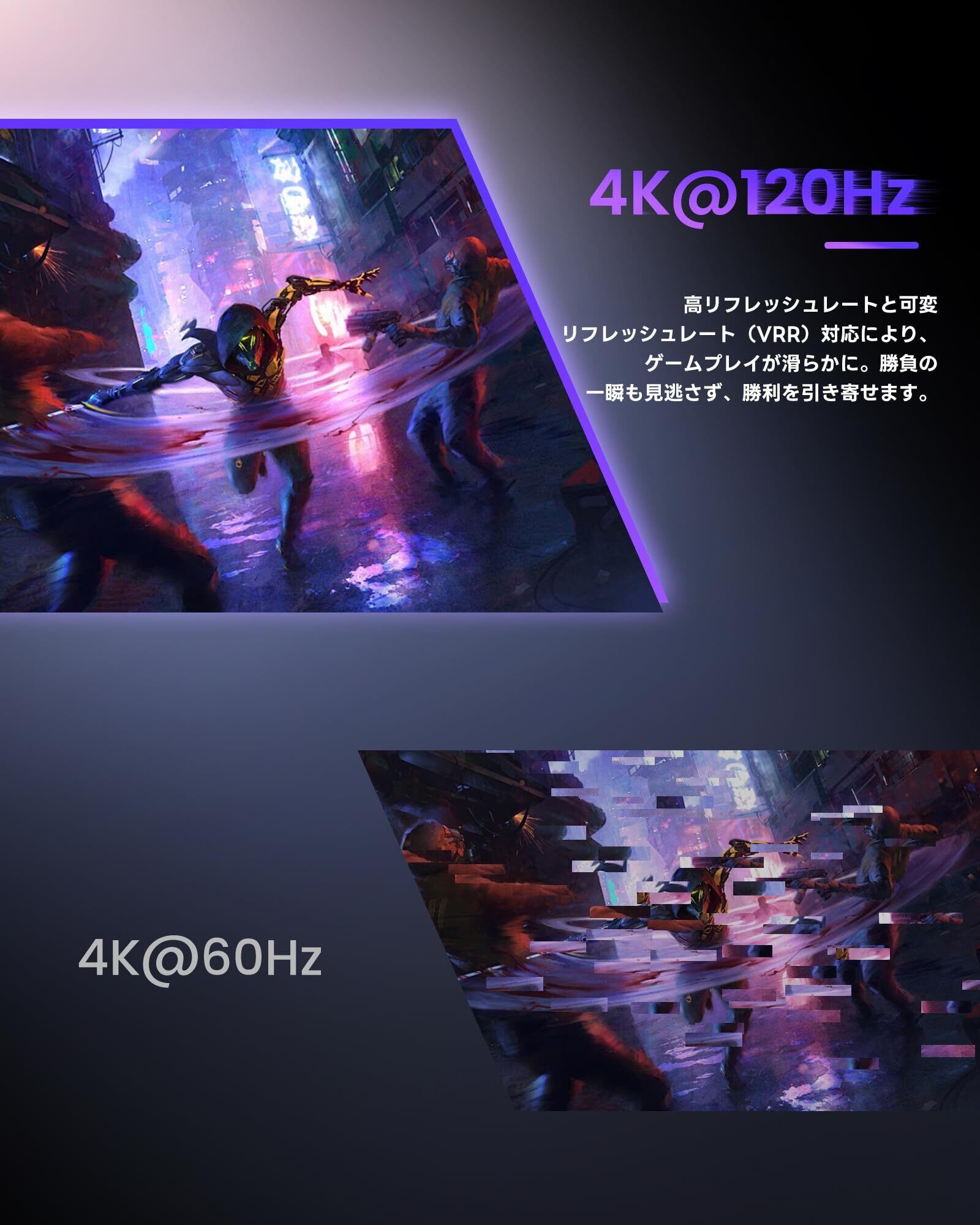 【8K@60Hz高画質】8K@60Hz、4K@120Hz/60Hz、1080P@240Hzに対応し、下位互換性も備えているため、シームレスに使用できます。VRR(可変リフレッシュレート)、Dynamic HDR、HDCP 2.3、Dolby Visionなどの最新機能を搭載し、リアルで没入感のある映像体験を実現します。 ※HDMIケーブルはHDMI 2.1規格準拠品をご使用ください(推奨ケーブル長:入力側2m以内/出力側2m以内)