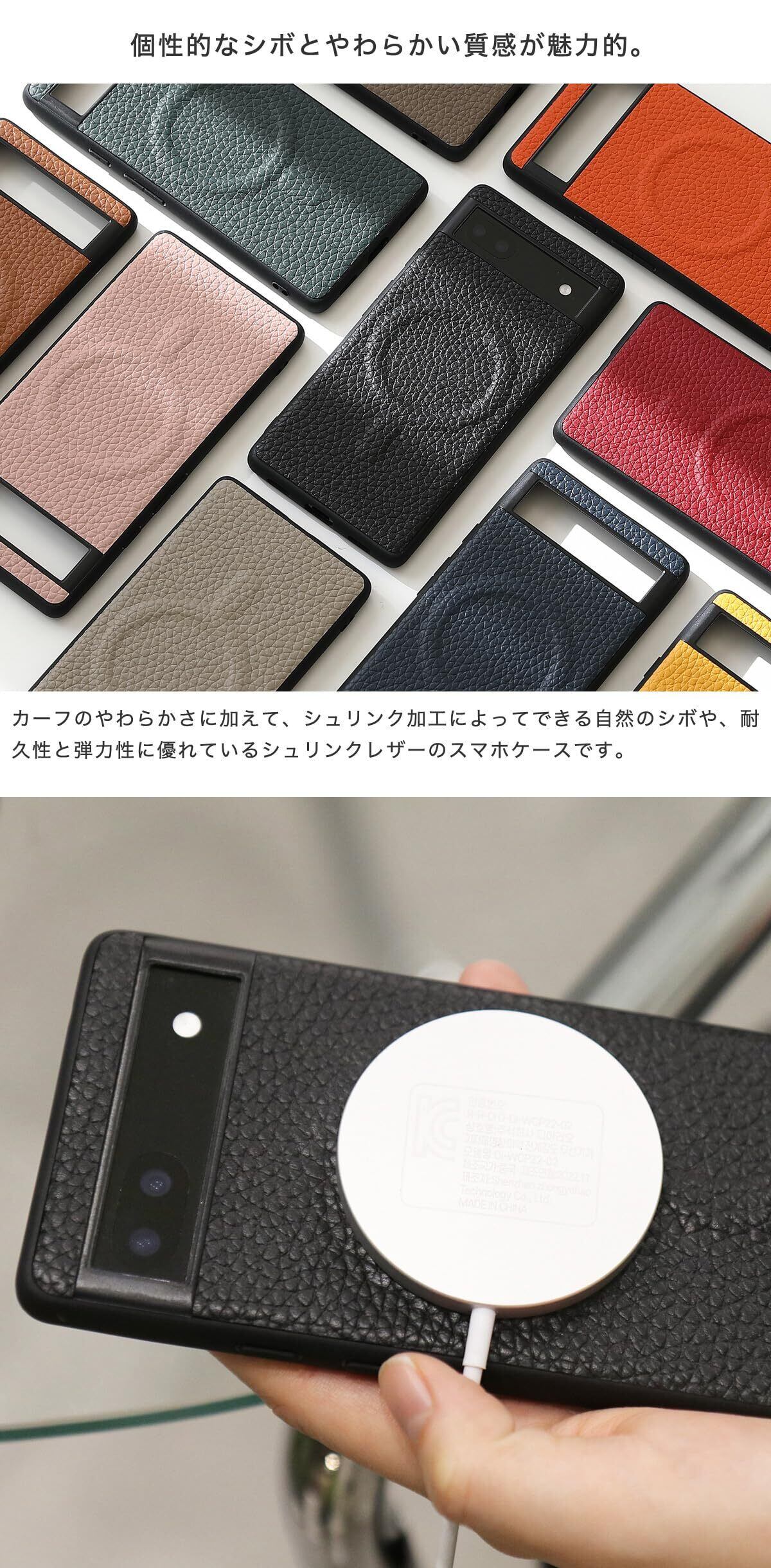 【素材】ケース背面 : シュリンクレザー(シュランケンカーフレザー)皮の銀面(製革工程で毛や表皮を除去した真皮の表面)を収縮(シュリンク加工)させ、本来の銀面模様を強調した革。 本体(内側) : PC(ポリカーボネート) 本体(側面) : TPU(熱可塑性ポリウレタン)