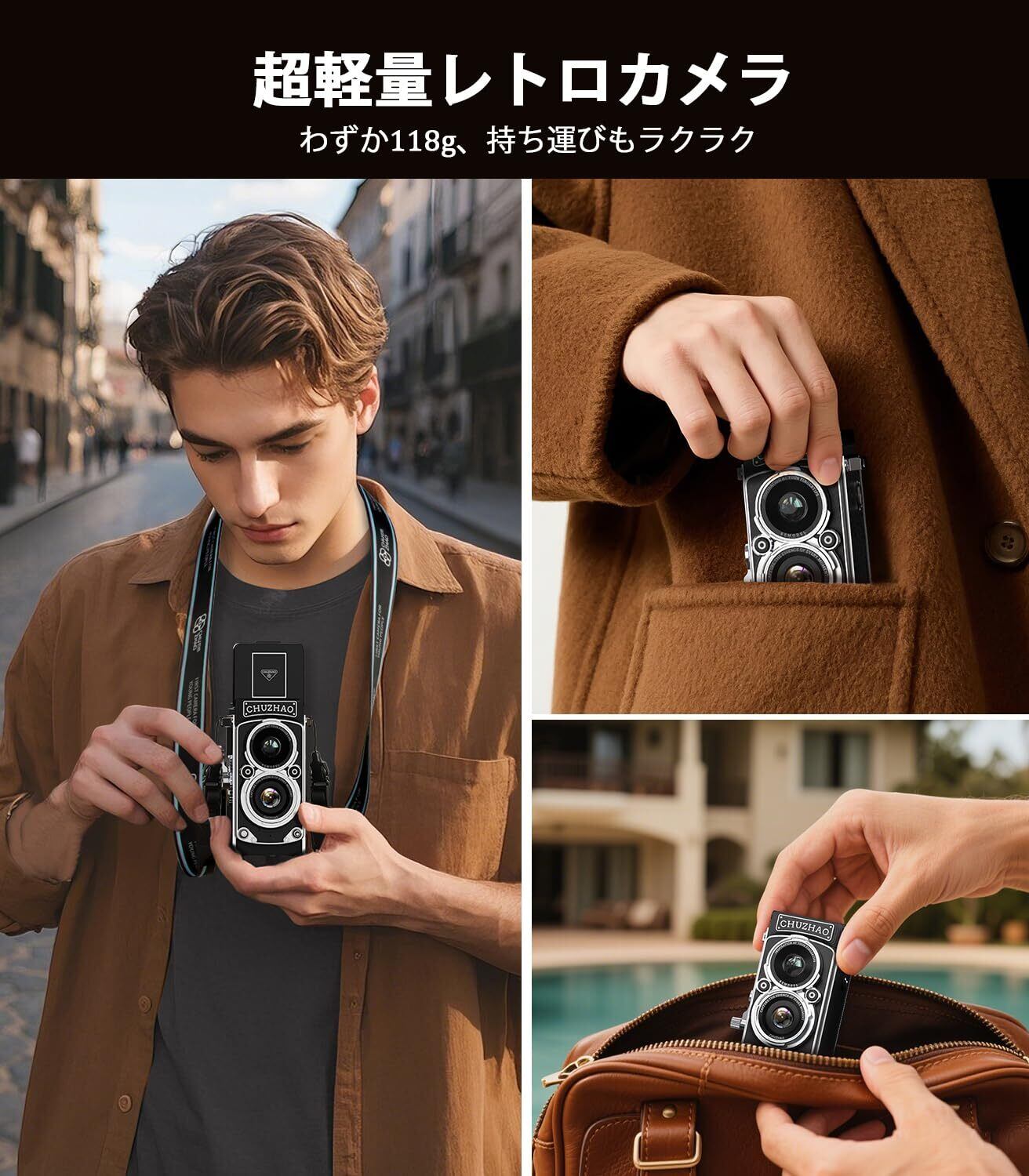 【軽量で持ち運びに便利】このミニレトロカメラは小型で軽量で、重さはわずか118gです。ポケットに簡単に入れたり、首から下げたりできるので、外出時にもストレスなく持ち運べます。 1000mAhバッテリーを内蔵し、長時間の撮影をサポートします。旅行、日常の記録、またはカジュアルなストリート写真撮影に最適です