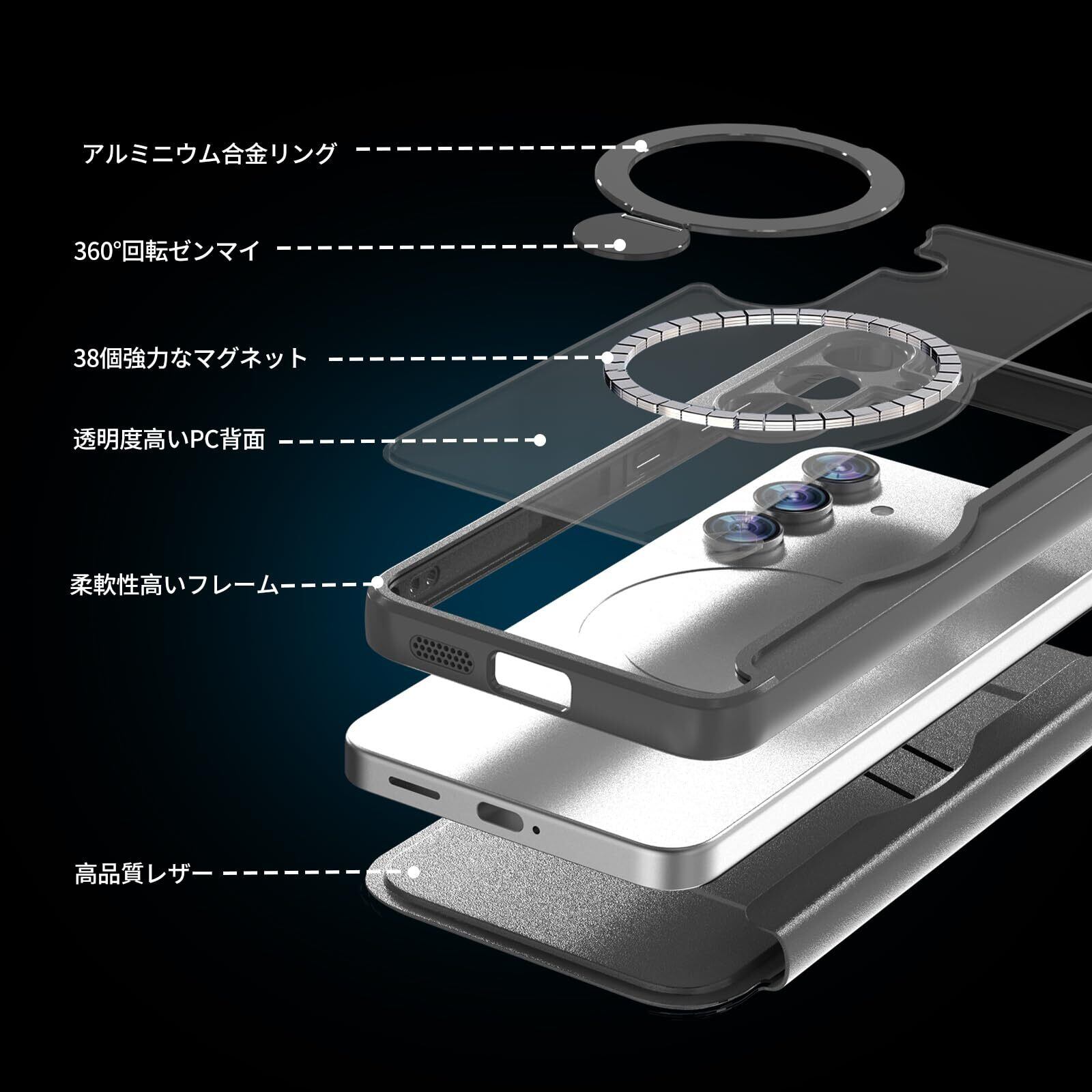 材質 アルミニウム合金リング 360°回転ゼンマイ 38個強力なマグネット 透明度高いPC背面 柔軟性高いフレーム 高品質レザー