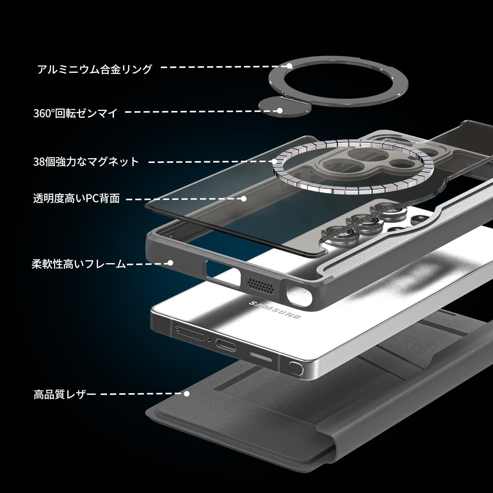 材質 アルミニウム合金リング 360°回転ゼンマイ 38個強力なマグネット 透明度高いPC背面 柔軟性高いフレーム 高品質レザー