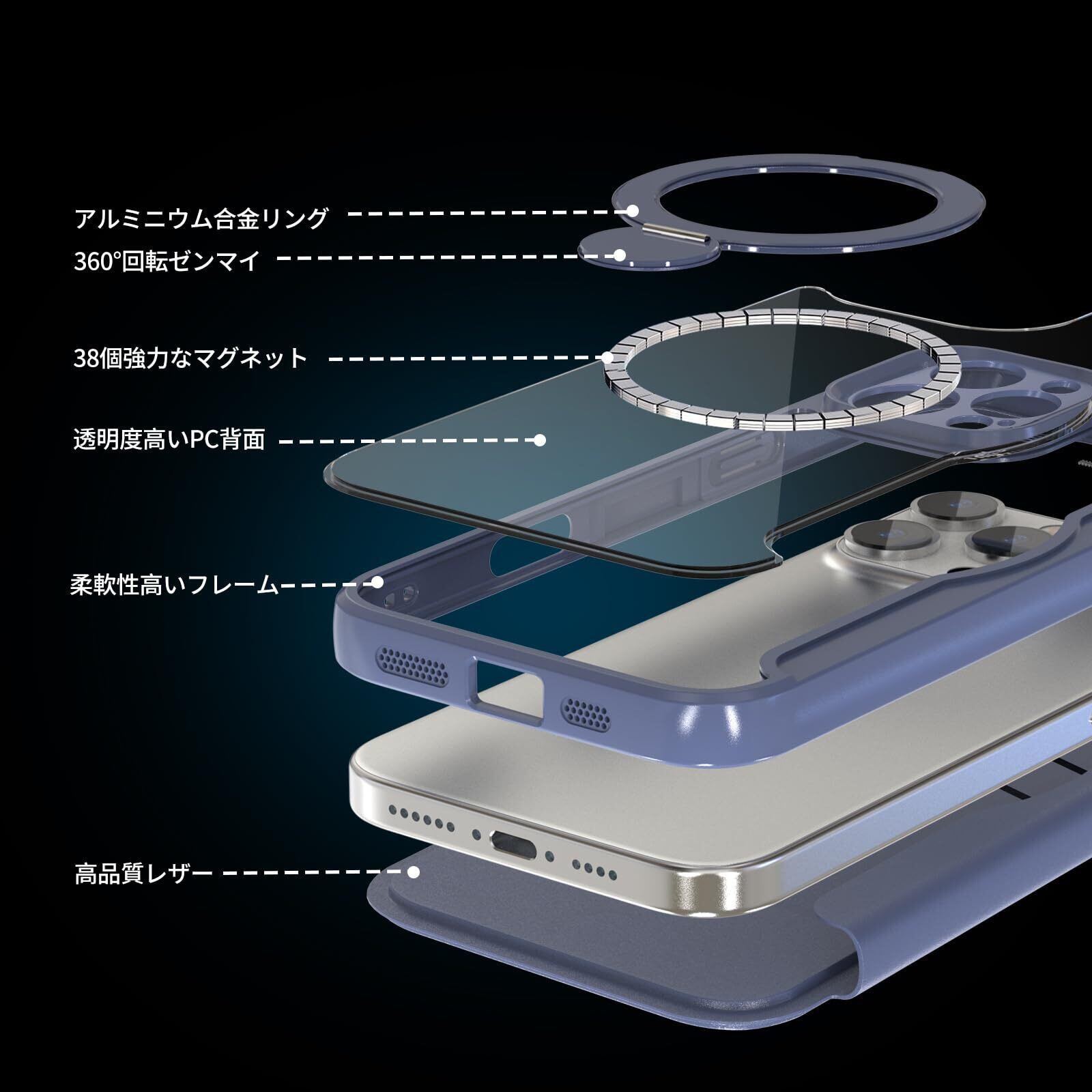 材質 アルミニウム合金リング 360°回転ゼンマイ 38個強力なマグネット 透明度高いPC背面 柔軟性高いフレーム 高品質レザー