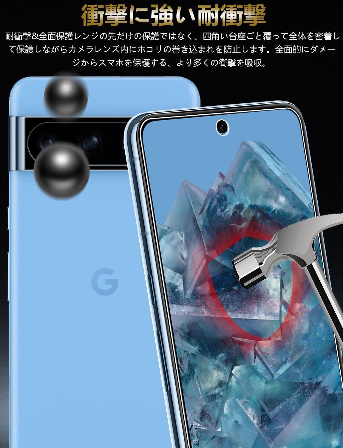 た 【超安全性・飛散防止】この ピクセル8 PRO 液晶保護ガラスは業界最高レベルの硬さ9H+を使っており、4.5時間以上の高温処理加工しておりますので、ガラスフィルムは通常のガラスの硬さの5倍に達しましたかぎやナイフなどの鋭いものに触れても傷しにくいです更にガラスの表面に防爆PET層を増やして、衝撃されても割れたら飛散しなく、ユーザー様の身の安全を守りますあなたの大切な携帯電話のカメラ画面を衝撃や傷から守る。
