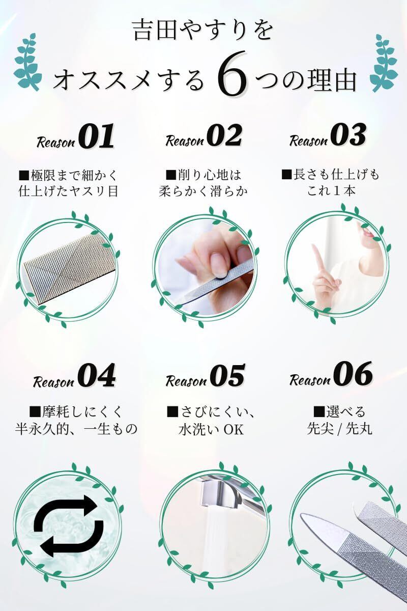 吉田ヤスリ製作所の爪ヤスリは1本1本職人の手作りです。 3段やすり目仕立てで、3本の直線が交差することで多数の点を形成、滑らかな削り心地を実現します。 素材はオールステンレスのため、サビにも強く衛生的にご使用いただけます。 また、ヤスリ目は摩耗することなく半永久的にご使用いただけます。 日本製の伝統ある製品のため丁寧に作られており、廉価な製品にはない良さがあります。