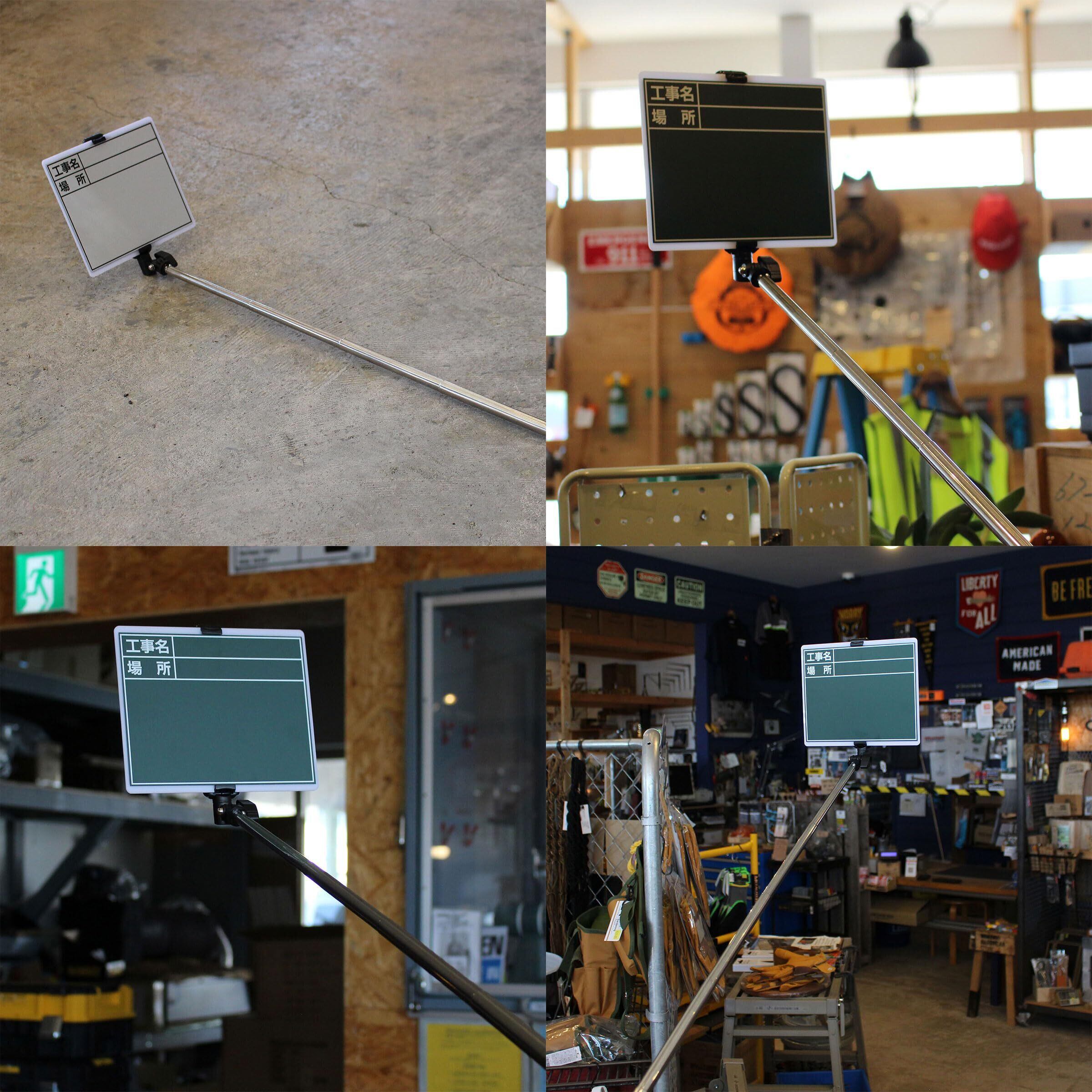 建築・建設現場や土木作業に工事現場など、記録写真の撮影に持ち運びに便利なコンパクトタイプで、1人で撮影作業が出来る伸縮式の工事用黒板です。