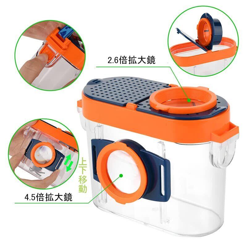 【適用性 特徴】 観察レンズがついている虫かごです!4.5倍の拡大鏡で、昆虫の細かいパーツまでよく見えます! 自然や昆虫に親しみ、昆虫を知るだけでなく、集中力や観察力を養う。 子供たちに、周りの世界の小さな生き物を捕まえ、研究し、解放することを奨励します。 子供たちが知識を広げ、探求と学習への子供たちの興味を刺激するのに最適です。