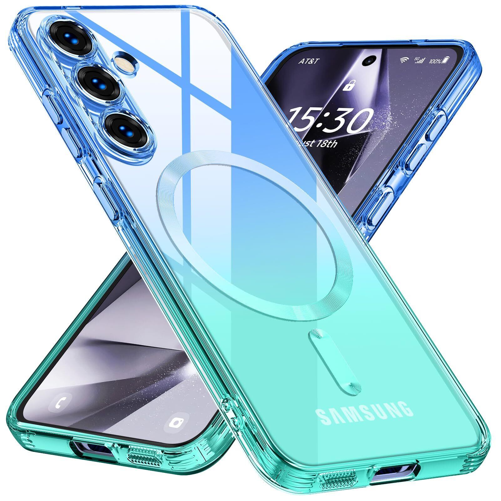 Galaxy S24 用 ケース Magnetic対応 クリア TPU グラデーション色 SC-51E SCG25 用 ケース ストラップホール付き ギャラクシーs24 用 携帯カバー 耐衝撃 透明 マグセフケース マグネット搭載 ワイヤレス充電 薄型 軽量 一体型 変形防止 全面保護カバー ブルー/緑 W-CXSX-05-05