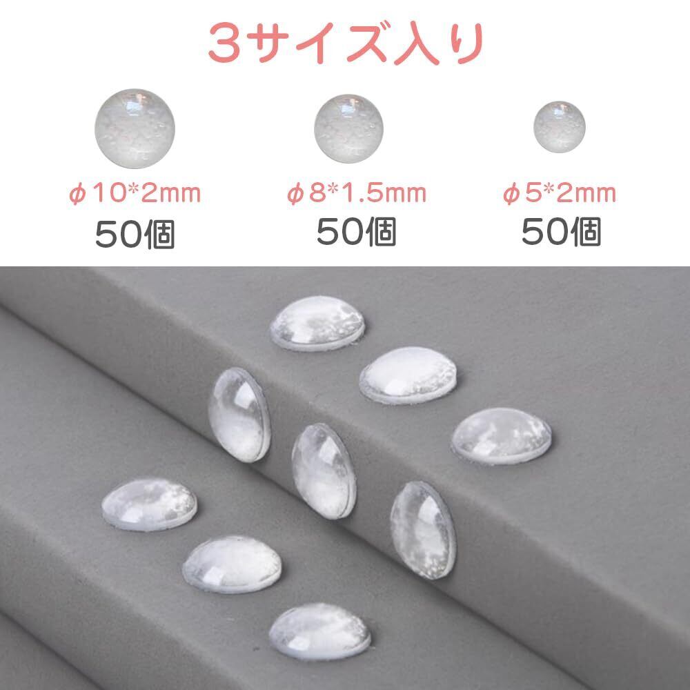【サイズ】φ5mm×2mm、φ8mm×1.5mm、φ10mm×2mm。 【セット内容】150粒(3サイズずつ50粒)。 【カラー】透明色、どんな場所にも馴染む。