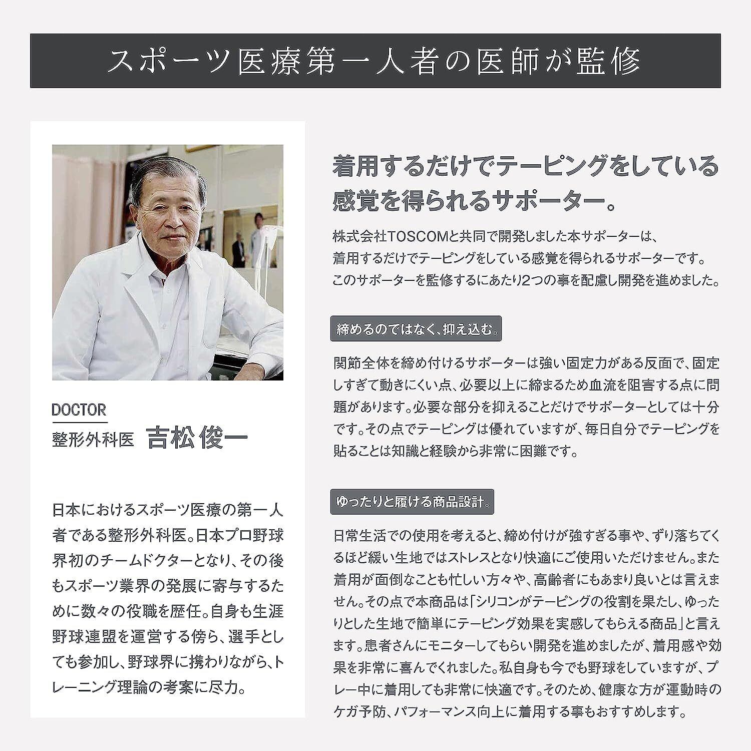 履くだけで簡単にテーピングが出来るシリコンサポーターです。従来のサポーターでは「必要ではない場所まで締まり過ぎて痛い」「固定する力が弱すぎてサポート機能が感じられない」等の不満をシリコンの3次元テーピング構造で解消しました。ハニカム構造をシリコンに用いることでタテ、ヨコ、ナナメの全方向に伸縮するため、生地には締め付け感が無く、シリコンを塗布した部分のみしっかりと固定します。生地は吸水速乾性のあるポリエステルを採用、抗菌防臭加工も施してありますので一年を通して着用できます。適応サイズは、膝頭がMは30~34cm、Lは34~38cm、LLは38~42cmです。