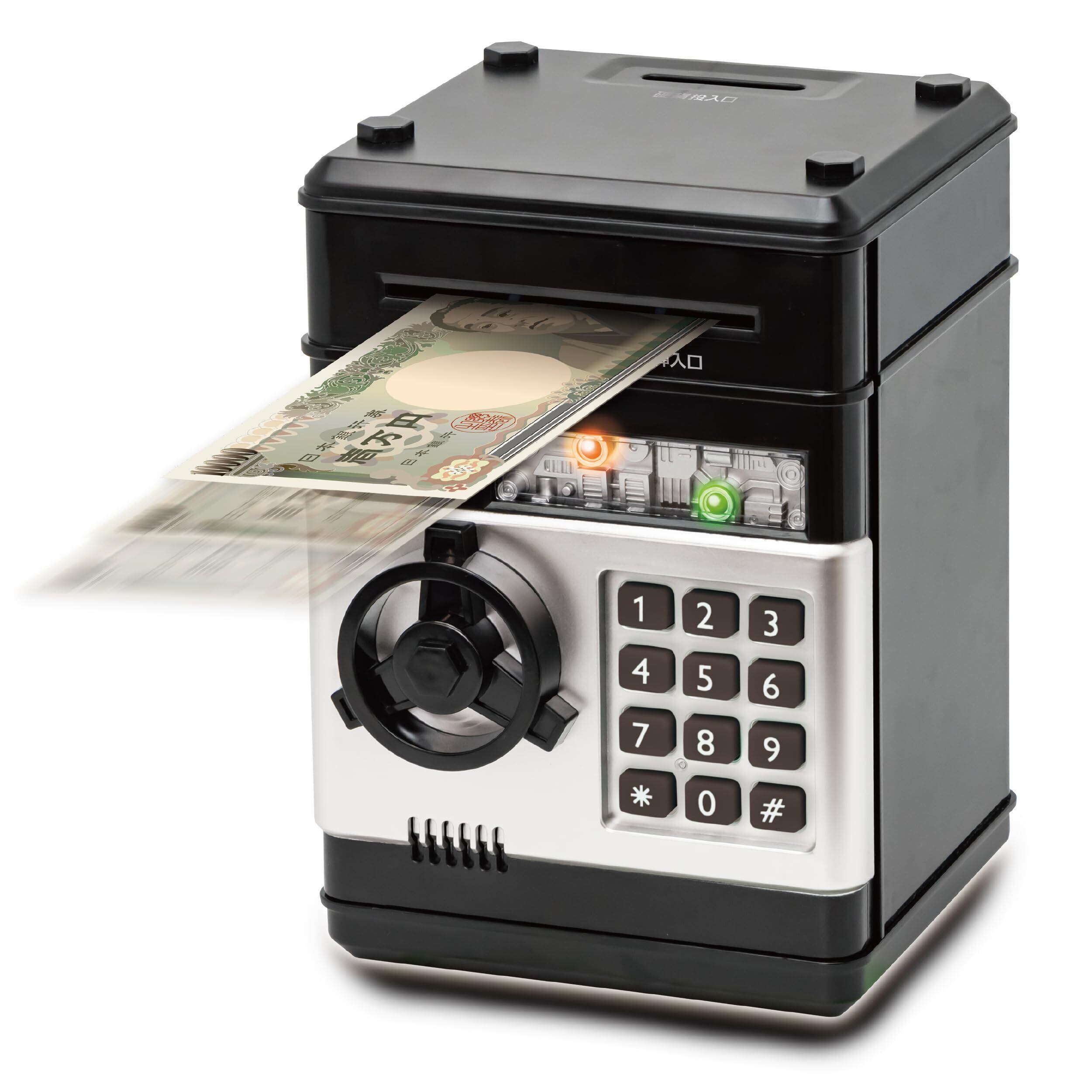 【使用方法】●紙幣挿入口に紙幣を近づけると、紙幣が自動で吸い込まれます。 ●効果は本体天面の硬貨挿入口から入れてください。 ●貯金箱を開ける際は4桁の暗証番号が必要です。初期設定は「0000」です。初めて使用される際は「0」を4回押してください。 ※暗証番号が間違っているとライトが赤く点灯し、不正解音が流れます。暗証番号が正しいとライトが緑に点灯し、正解音が流れ、ロックが解除されます。 ※暗証番号を忘れた場合は、本体から電池を抜き、初期設定の「0000」に戻してください。