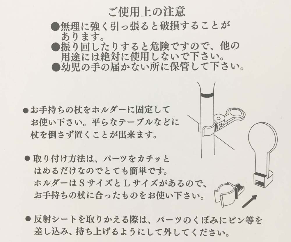 ホルダーはSサイズとLサイズがあるので、お手持ちの杖に合ったものをお使い下さい。