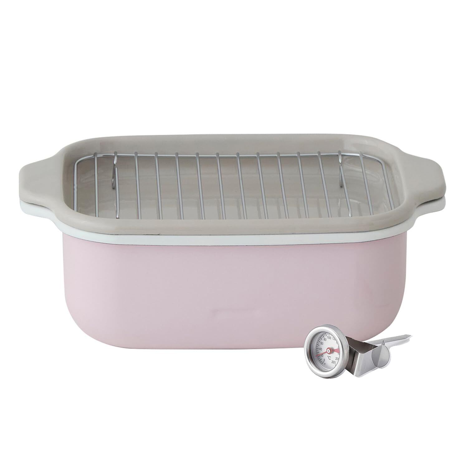 富士ホーロー 角型 天ぷら鍋 ピンク ワイド 27.7×17.3cm IH 対応 温度計 揚げ網 バット 付き