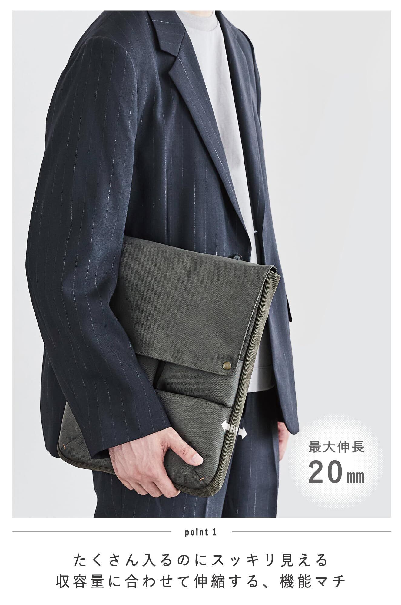 在宅とオフィスを横断して働くワーカーに合った機能とデザイン。日々変化する収容物の容量に合わせて伸縮性する機能マチと、小脇に抱えた時におしゃれに見えるデザイン性を両立。