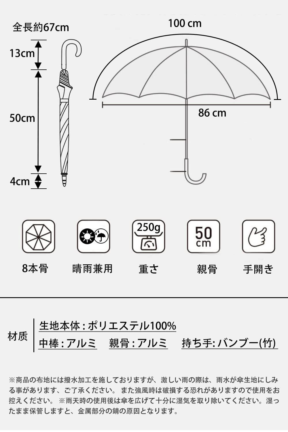 ✦【天然素材感のある持ち手・高級感たっぷり】焼き加工を施したバンブーハンドルは、触れているだけでほっこりとした気持ちに。水に濡れても変形しずらい、丈夫で汚れがつきにくい特徴があります。カジュアルな服装にも、きれい目な服装とも相性抜群。竹手元は一本一本手作業で作られ、手触りが良く、握りやすくて、見た目も良いです。いつでも持ち歩きたくなる気持ちの良い傘に仕上がりました。