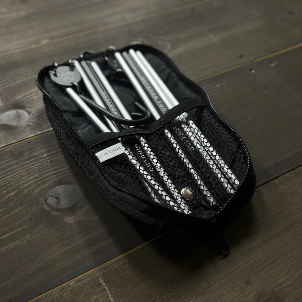 コンパクトに折りたためて、 持ち運びができるトラベルハンガー。 簡単に4つ折りにして、コンパクトに持ち運びができるトラベルハンガー。 旅行やキャンプなどはもちろん、日常の外出先でのちょっとした時にも活躍します。 ハンガーにはアルミニウムを使用しているので、耐久性にも優れており 1本あたり約90gと軽くてスリムなので邪魔になりません。 チェーンで繋がっているのでバラバラにならず、黒い筒状のパーツをスライドさせるだけですぐに組み立てられます。フック付の専用ケースも付いているので、ちょっとした所に引っ掛けておくことが出来持ち運びも楽に出来ます。