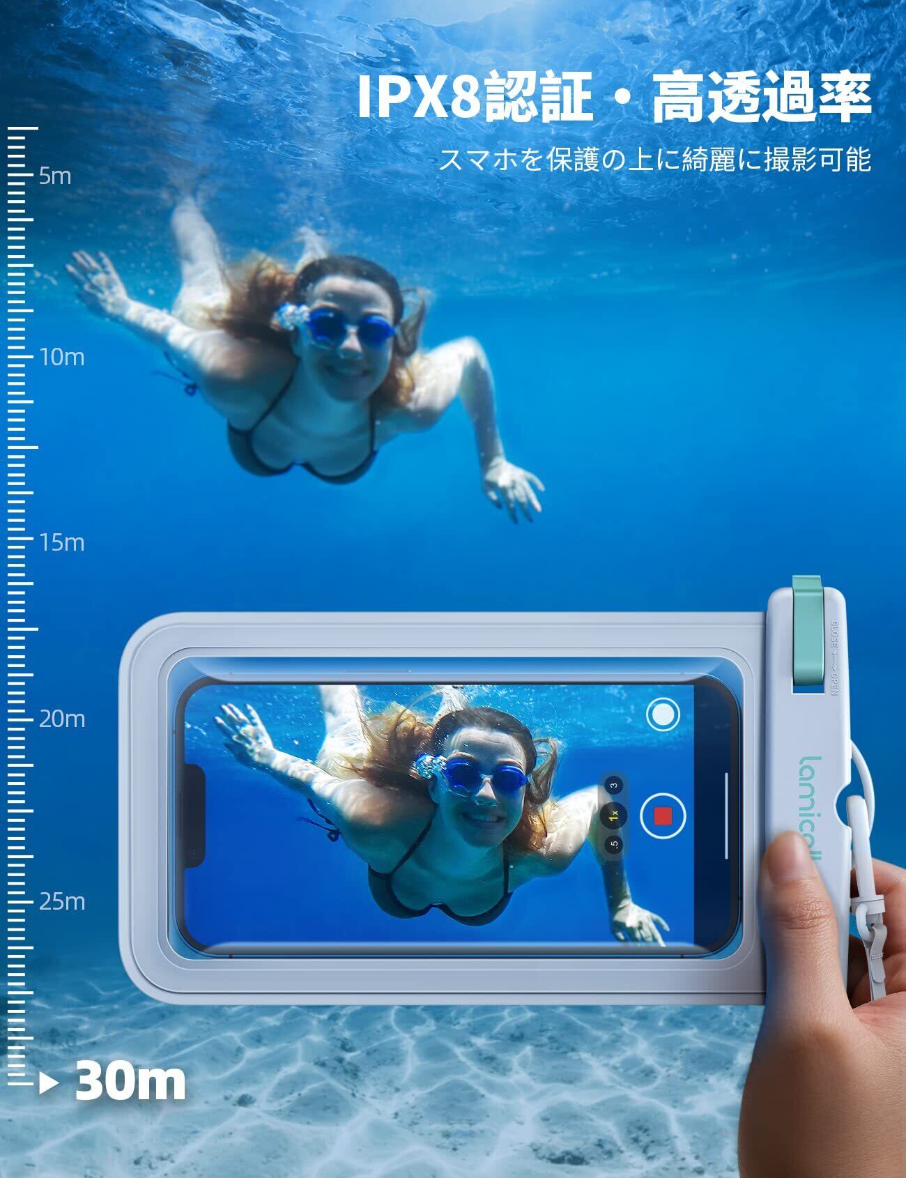 防水国際保護等級IPX8認定を取得したスマホケースです。水気のある場所での操作に圧倒的な耐性があります。また、一般的なスマホ防水ケースでは、縁の部分が鋭利になっており皮膚を傷つけてしまうことがありますが、本製品はナノ熱圧技術により怪我を防止する設計を採用しました。愛用スマホだけではなくて使用者も守ります。