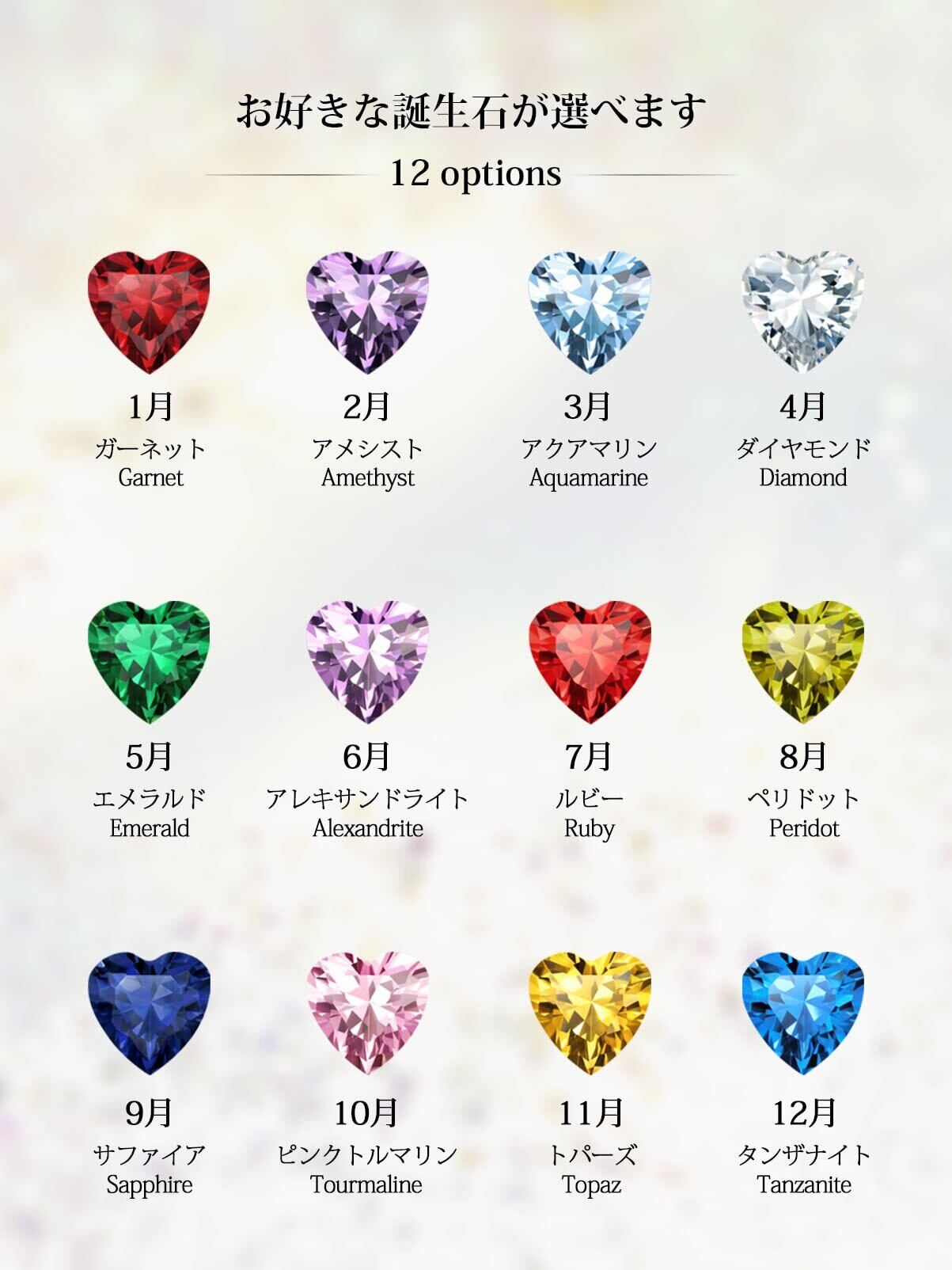 [誕生石リング] (1月)ガーネット、(2月)アメシスト、(3月)アクアマリン、(4月)ダイヤモンド、(5月)エメラルド、(6月)アレキサンドライト、(7月)ルビー、(8月)ペリドット、(9月)サファイア、(10月)ピンクトルマリン、(10月)オパール、(11月)トパーズ、(12月)タンザナイトの13種類の誕生石からお選びいただけます。