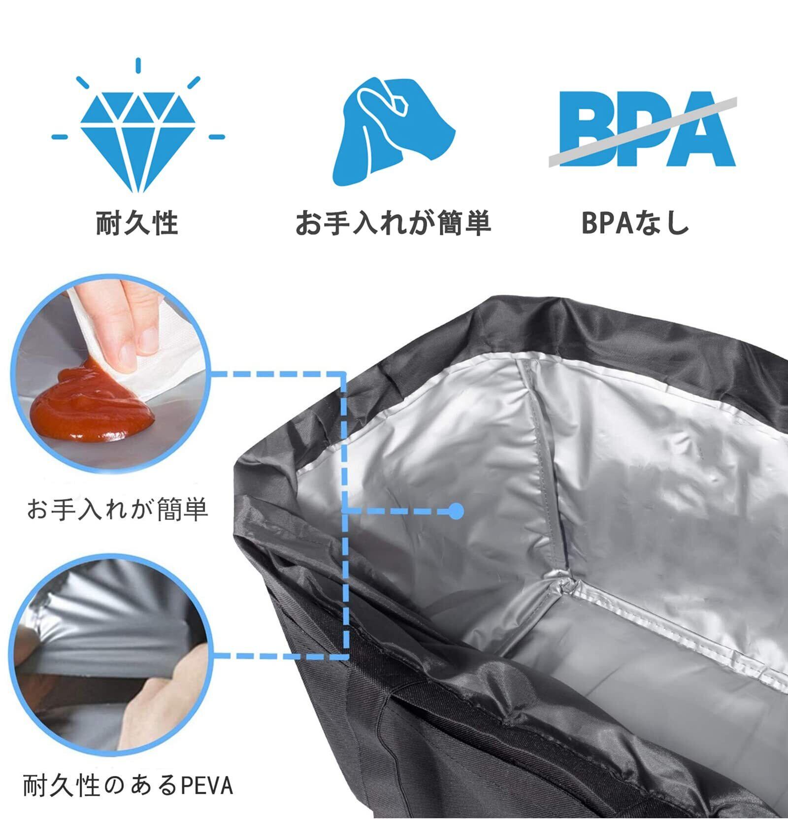 【高品質の素材】 カチオン性生地とPEVA裏地で作られています、優れた保温・保冷効果を発揮します、食材の新鮮さや、冷たい飲み物などそのままキープできます。上部は巾着式なので、紐で袋をしぼることができ、食べ物や飲み物が落ちる心配はありません!