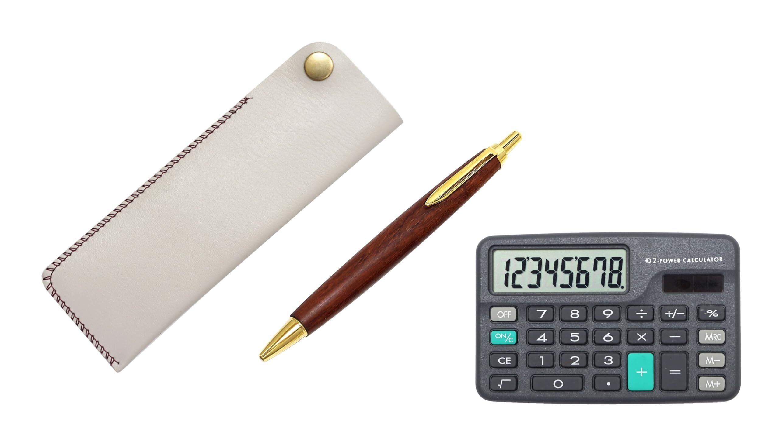 電卓とホック式ペンケースと木軸ボールペンのセット。※ペンケースの中に電卓を入れる事は出来ません。