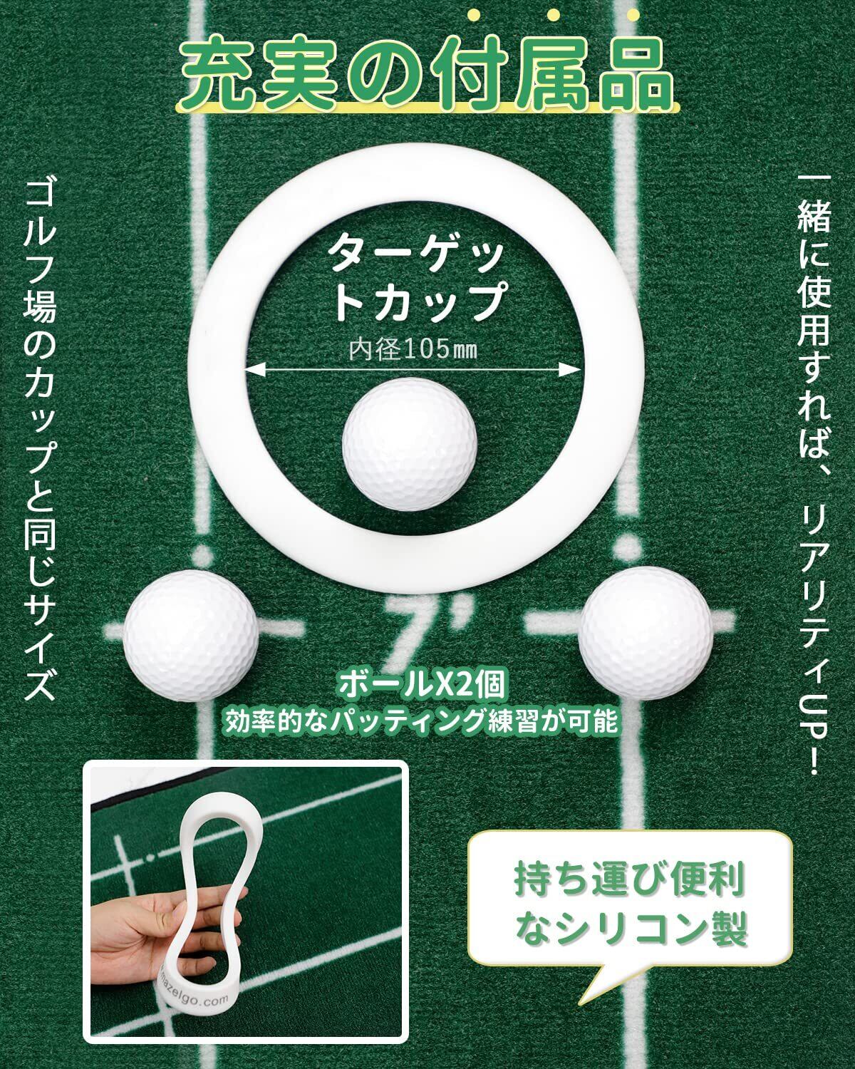 【自信をつける!豊富な練習が行える】柔らかく耐久性に優れたナイロンを採用、できるだけ実際のグリーンに近い環境を再現して、微妙なタッチの感覚を掴みやすいです。長さが282cm、幅が30cmあるため、ショートパットからロングパットまでさまざまなパッティング練習が行えます。下に雑誌などを入れれば、好みの角度をつけることが可能。パターカップに合わせて、さまざまなパッティング練習を行えます。