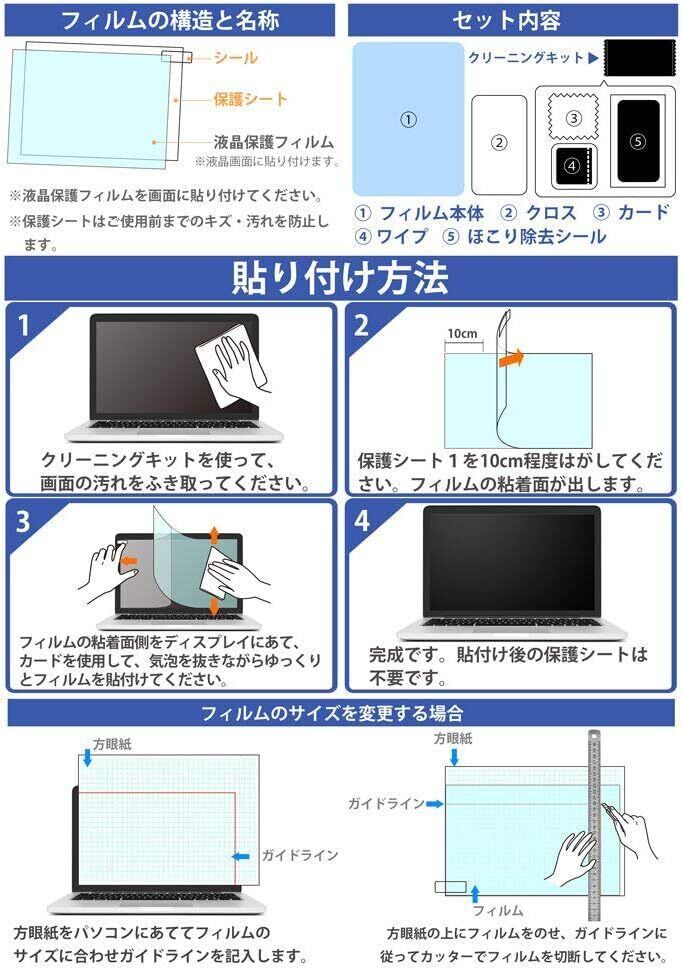 【ご購入前に】:※フィルムサイズをお確かめの上、ご購入ください。※外箱は汎用品のため、外箱の説明と内容品は異なります。開封して中の説明書をご確認ください。【対象機種】:15.6インチワイド(16:9)インチの画面を対象にしています。【フィルムサイズ】:34.4cm×19.4cm 【サイズ調整可能・方眼紙付き】:このサイズより小さい液晶ディスプレイであれば、方眼紙とカッター、定規を使い、切断して大きさを調整することができます。【タッチパネル対応】:タッチパネルの端末でも問題なくご使用いただけます。 【ブルーライトカット】:液晶画面から発生する目に有害なブルーライトを約48%カットし、目の健康を守ります。 【指紋防止】:表面をフッ素加工しており、指紋、皮脂がつきにくく、すぐふき取れます。 【抗菌性】:フィルム表面が抗菌処理されており、細菌の繁殖を防ぎます。 【画面保護】:硬度2Hのフィルムで液晶ディスプレイを保護します。また適当な柔軟性があり貼り付けやすいです。 【超反射防止】:ライトの反射や映り込みを低減し、ギラつきが無くなり画面が見やすくなります。 【気泡ゼロ】:特殊なシリコン吸着素材を採用。指やカードで簡単に押し出すことができます。貼り付け失敗した場合でも、はがして貼り直しが可能です。※ホコリが立ちにくい場所で拭き取りシート、クロス、ホコリ除去シールを使用し、ホコリを完全に除去してから貼り付けてください。 【フィルム貼り初心者様歓迎】: フィルムを綺麗に貼れるよう『充実の付属品』・『日本語取扱説明書』で全力でサポートいたします。