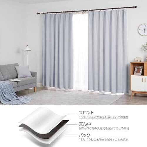 【一級遮光】このカーテンは遮光度が99.99%以上,外からの光をほとんど通さないため、昼間カーテンを閉めたお部屋のなかで相手の顔の表情が分からない程度にまでお部屋を暗くできます。同じ等級であっても、カーテンの明度や色彩によって遮光の度合いが変わります。薄い淡い色は光を通しやすく、濃い暗い色は光を通しにくいです。遮光性を重視される方は濃色をおすすめします。