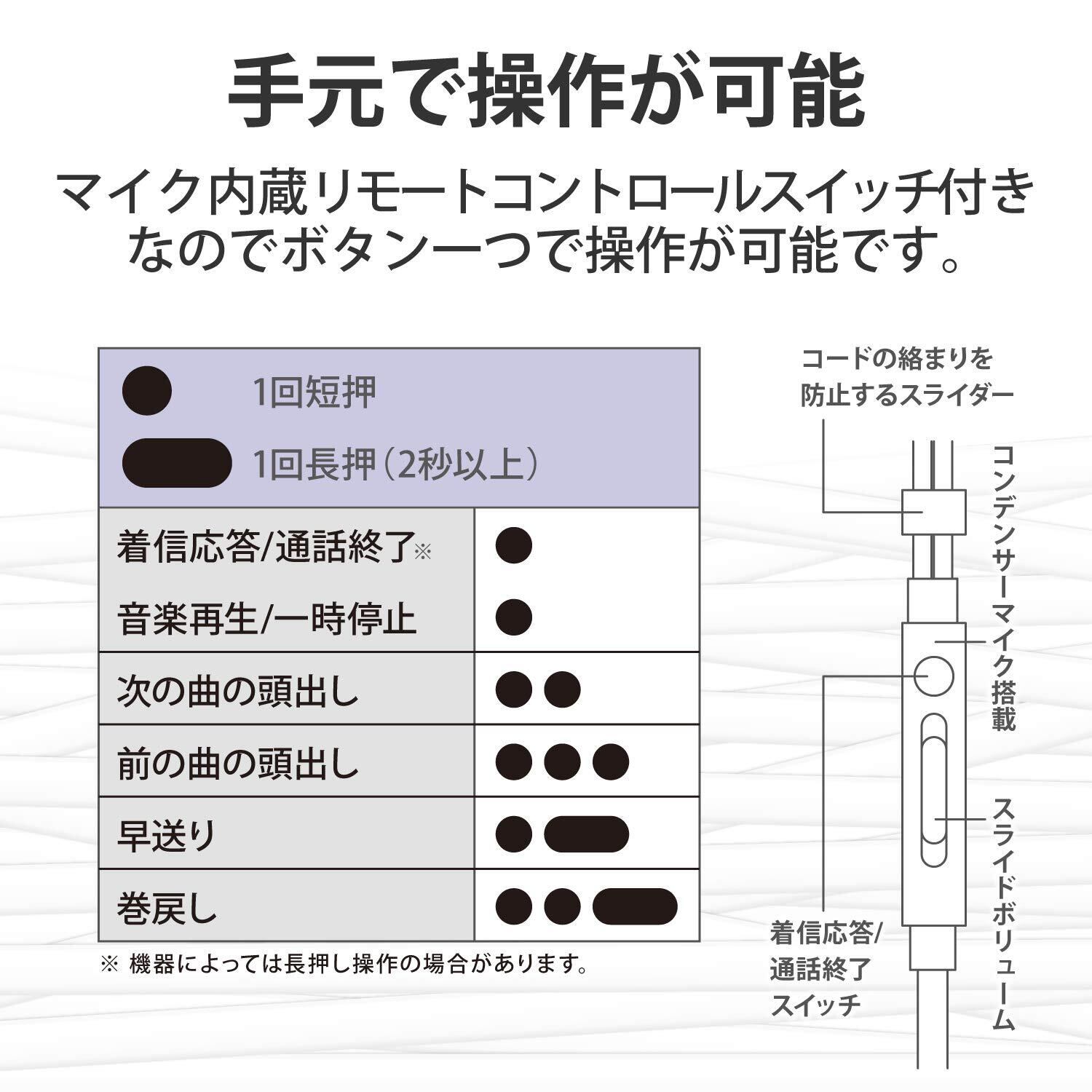 ■※接続するスマートフォンによって、音楽・動画再生時のリモコン機能を使用できる場合があります。操作方法は各スマートフォンによって異なります。