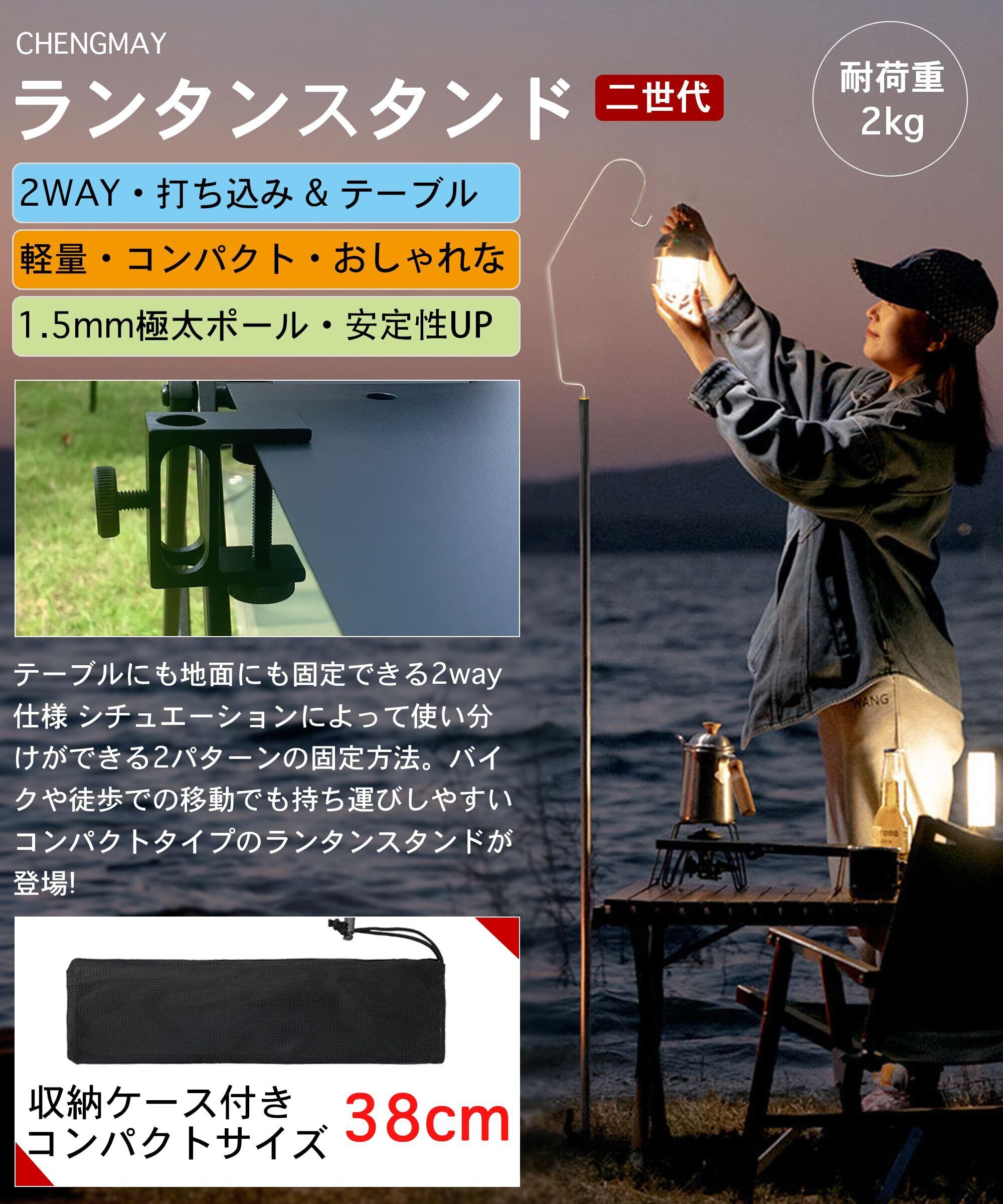 CHENGMAY ランタンスタンド ランタンポール 1.5mm極厚ポール 頑丈 打ち込み式 テーブル 2way 軽量 コンパクト 自立式 安定性強化 耐荷重2kg アウトドア キャンプ用品 収納ケース付き