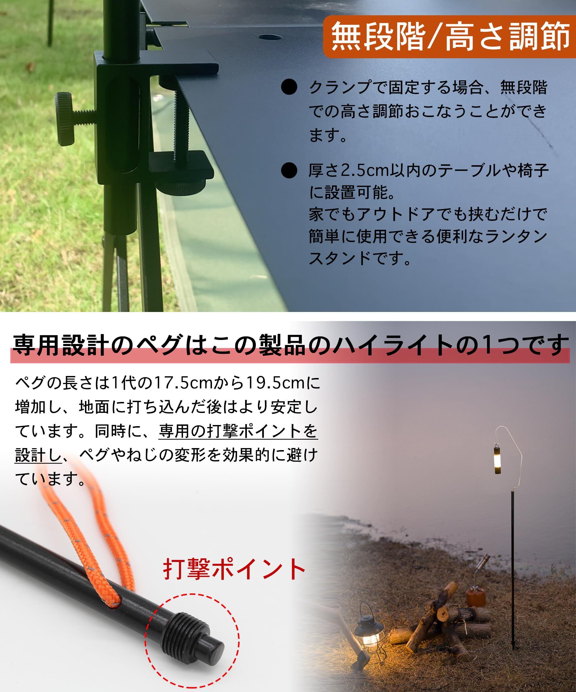 【専用設計のペグ】専用設計のペグはこの製品のハイライトの1つです。ペグの長さは1代の17.5cmから19.5cmに増加し、地面に打ち込んだ後はより安定しています。同時に、専用の打撃ポイントを設計し、ペグやねじの変形を効果的に避けています。1代の製品と比較して、2代の製品はペグとクランプが分離式であり、必要に応じてそれぞれ単独で使用できます、クランプで固定する場合、無段階での高さ調節おこなうことができます。この設計により、ペグはより柔軟かつ便利になり、キャンプ体験にさらなる便利をもたらします。