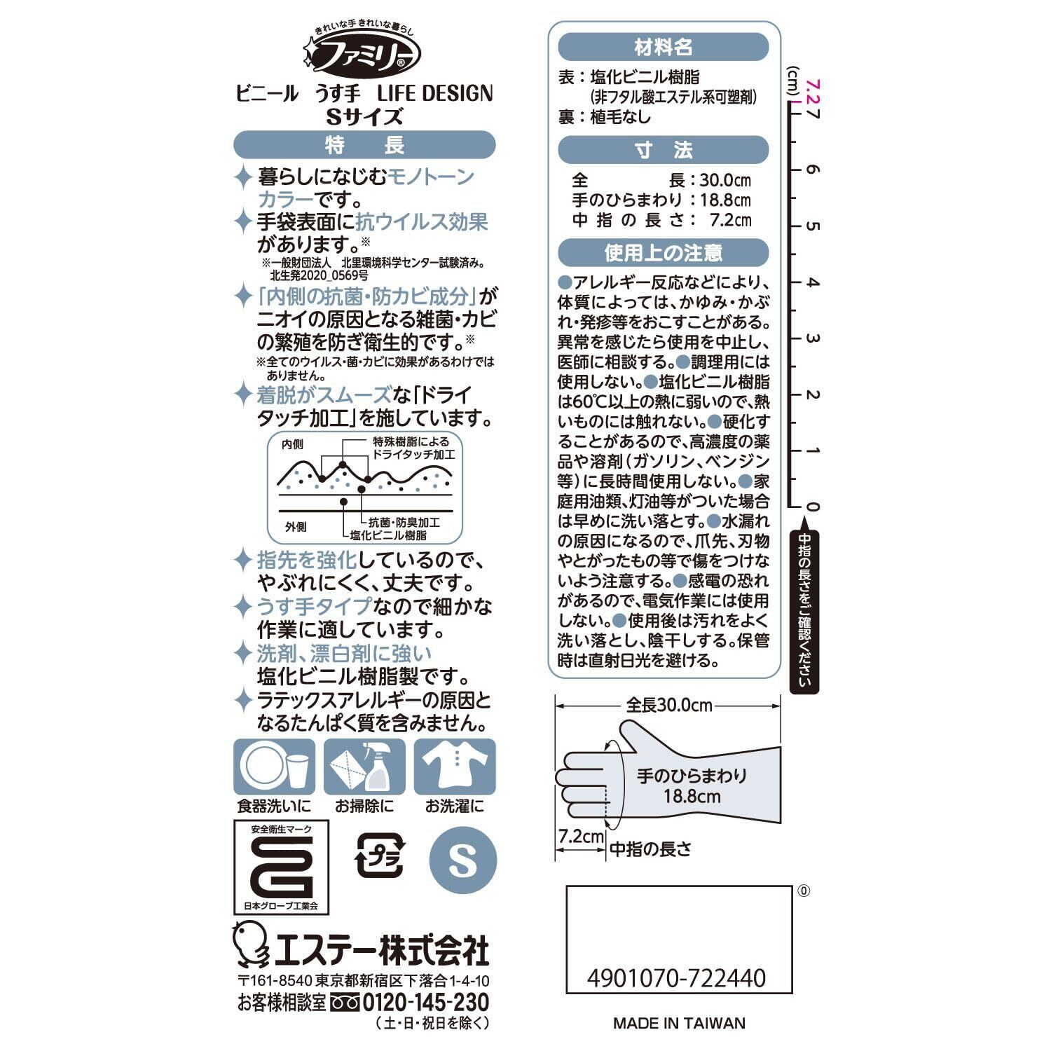 ファミリー [まとめ買い] ビニール手袋 うす手 ライフデザイン Sサイズ グレー ×6個 手袋 キッチン 食器洗い 掃除 洗濯 ビニール 手袋