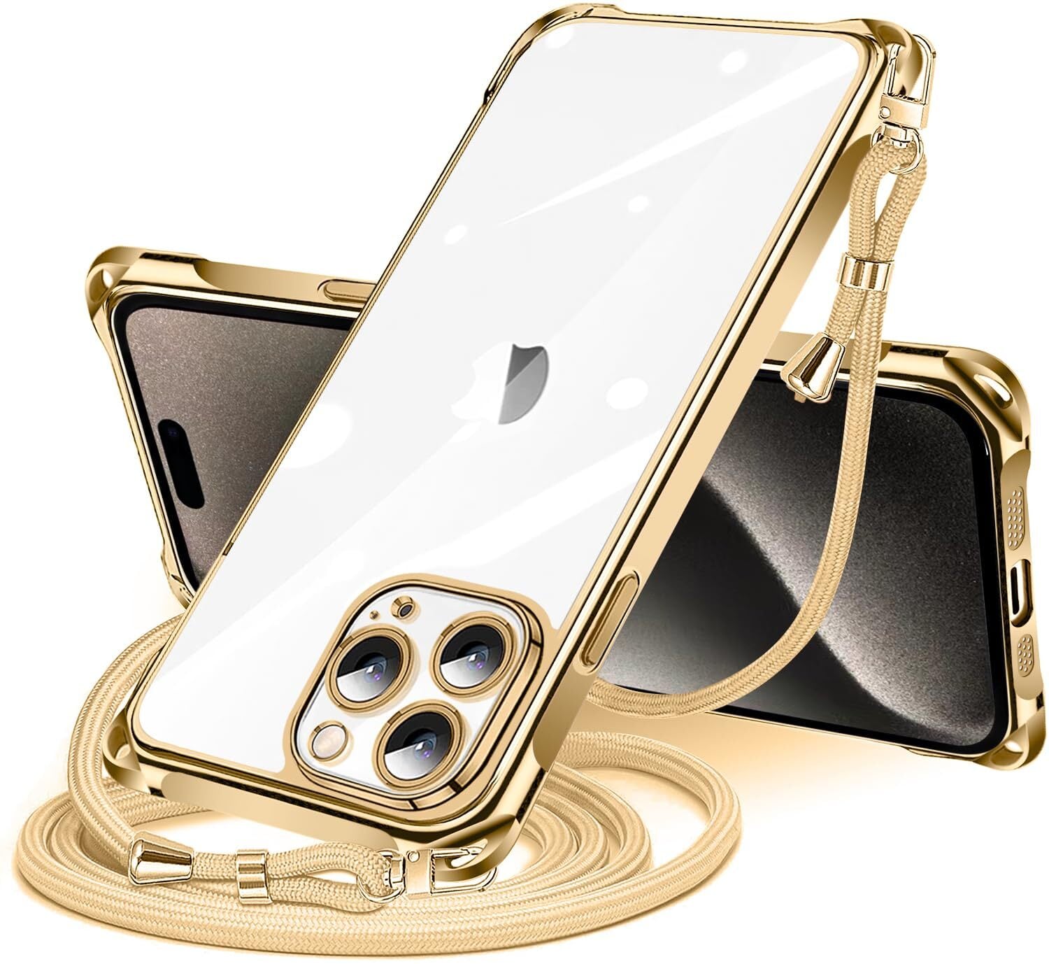 iPhone 15 Pro 用 ケース クリア ショルダー iPhone15pro 用 スマホケース アイフォン15Pro カバー 肩掛け 斜めかけ 縄掛けケース 透明 薄型 軽量 TPU 携帯ケース 紐付き 斜めがけ 織りストラップ付き ネックストラップ ショルダー ケース 縦/横 2WAY 長さ調整可能 取り外し可能 落下防止 紛失防止 ワイヤレス充電対応 (ゴールド)
