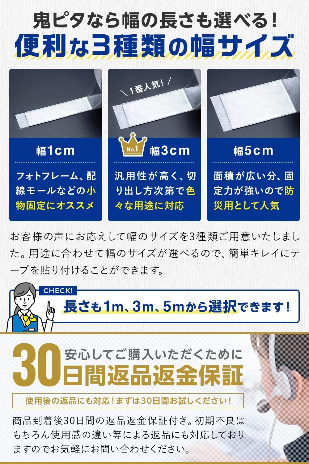 鬼ピタ 魔法のテープ 両面テープ はがせる 超強力 マステ付 保管袋付 壁紙対応 (横幅3cm×厚み0.2cm×長さ3M)