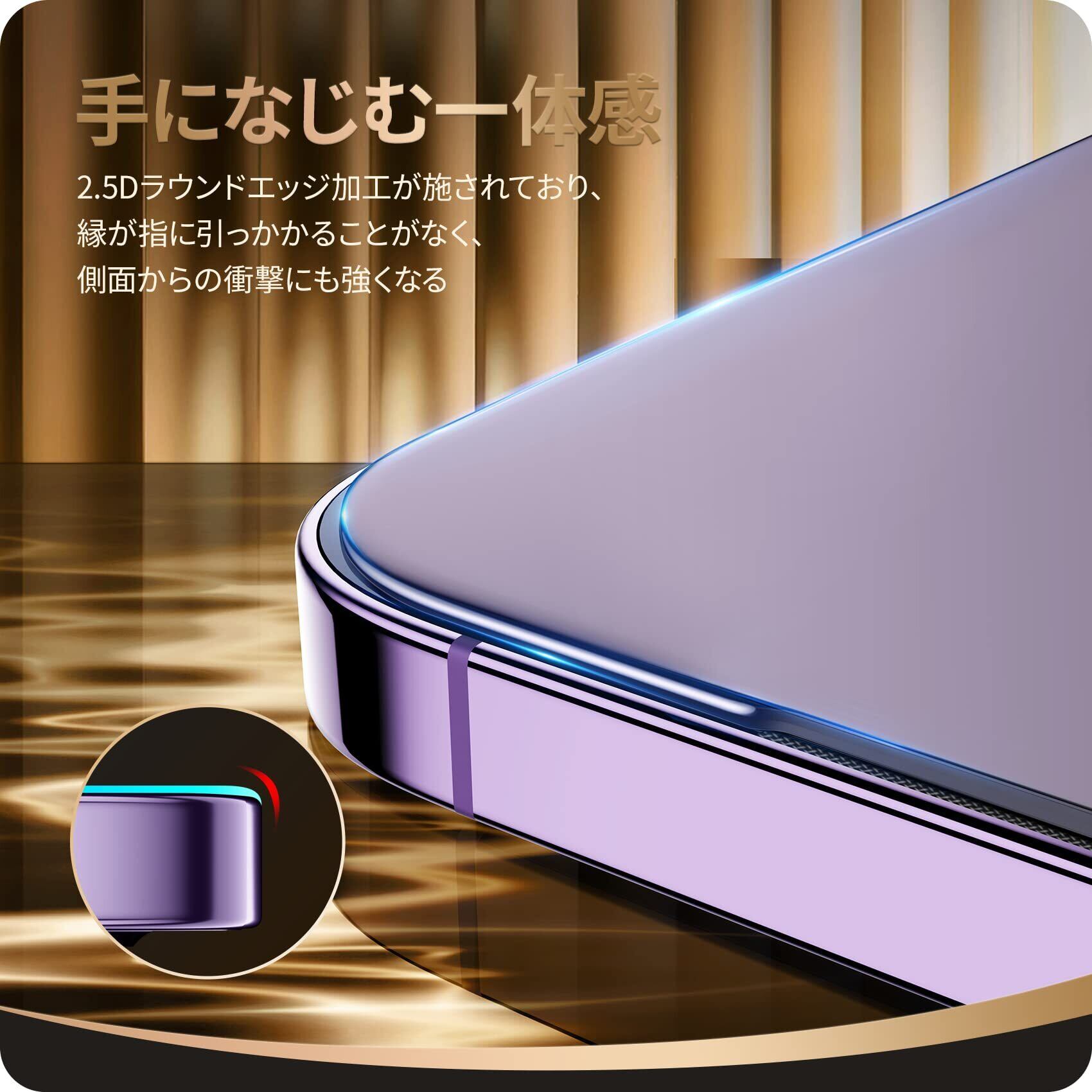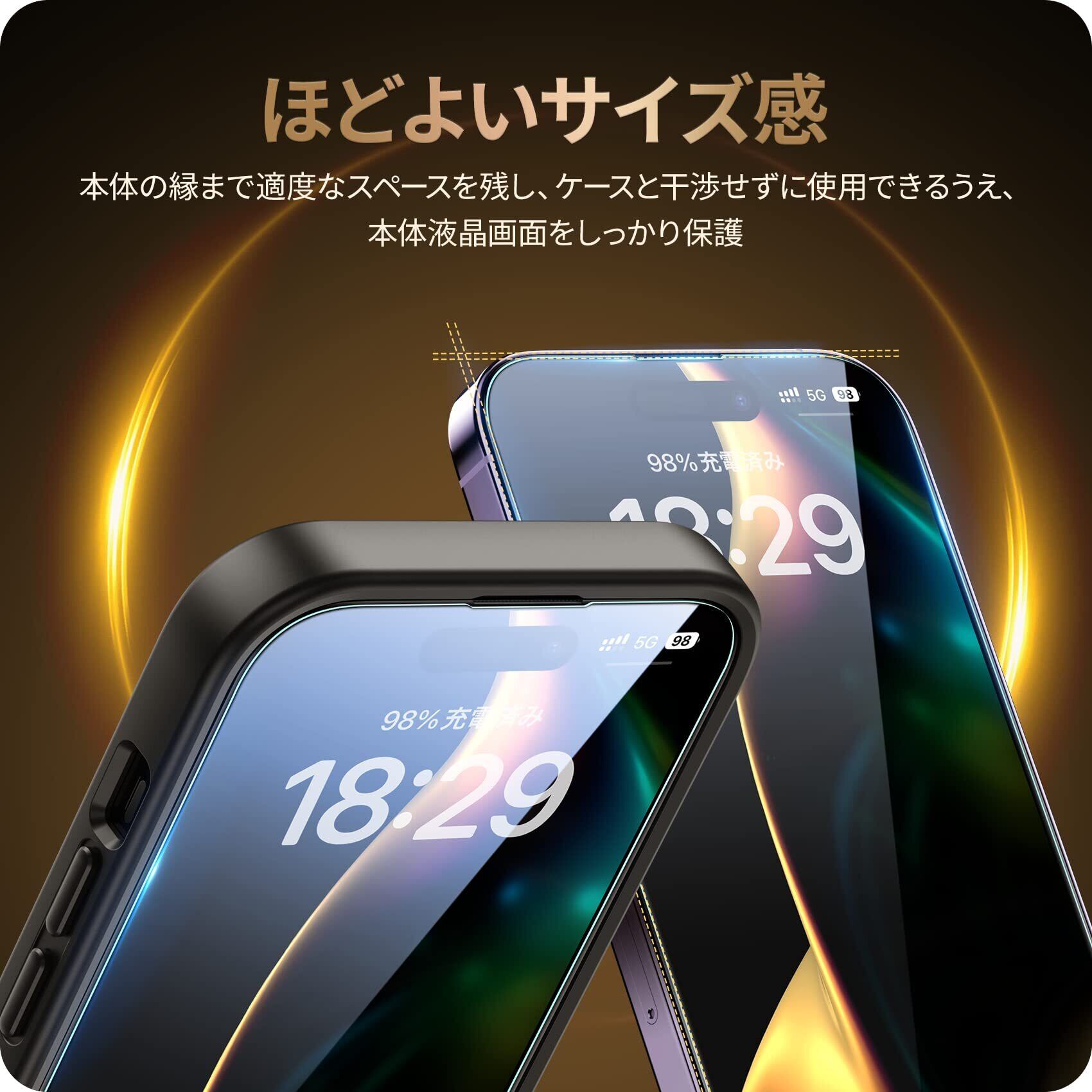 【9H硬度】9H硬度ガラスを採用し、ハードコーティング技術により外部からの衝撃を吸収し、iPhone14 Proの画面へのダメージを可能な限り抑えます。飛散防止加工により万一割れてもガラス破片が飛び散りにくいです。