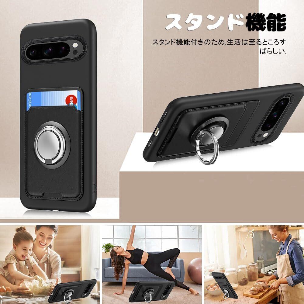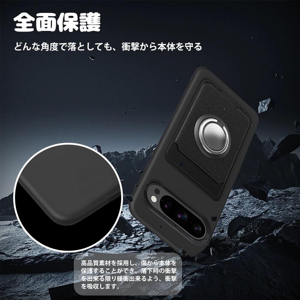 For Google Pixel 9 Pro XL ケース カード収納 リング付き 保護カバー ピクセル9ProXL スマホケース リング スタンド付き ストラップホール付き シリコン スタンド機能 耐久 マット質感 滑り止め 指紋防止 黑