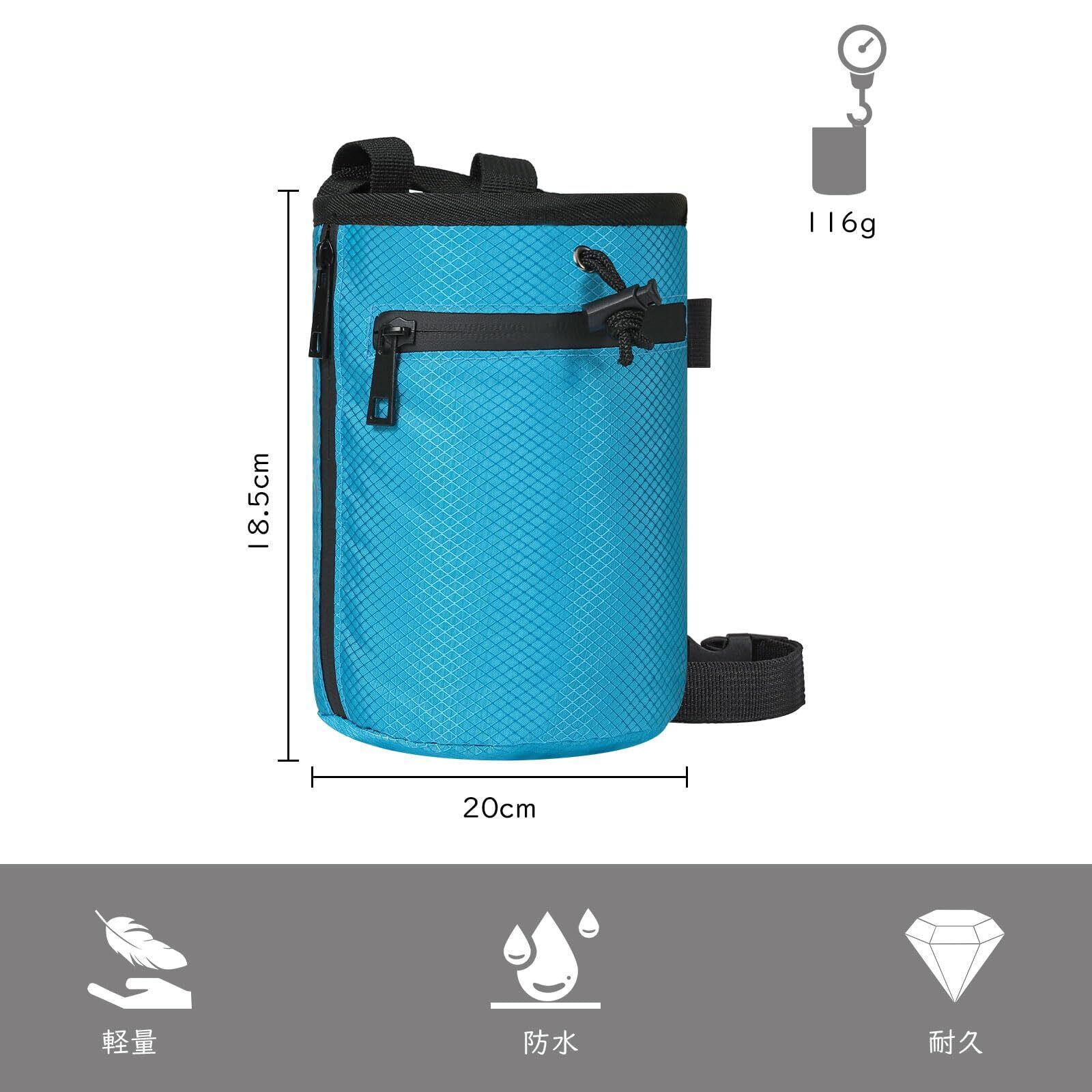 MoKo チョークバッグ ウエストポーチ巾着式 筒状 腰付けタイプ 広い開口部 斜め口式 表地ナイロン 裏地フリース ファスナーポケット配置 カラビナ付き 小物入れ ボルダリング クライミング アウトドア