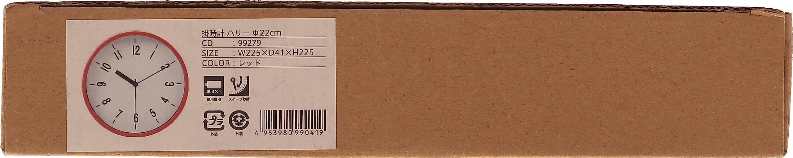 不二貿易 掛け時計 直径22.5cm レッド スイープ 連続秒針 静音 ハリー 99041