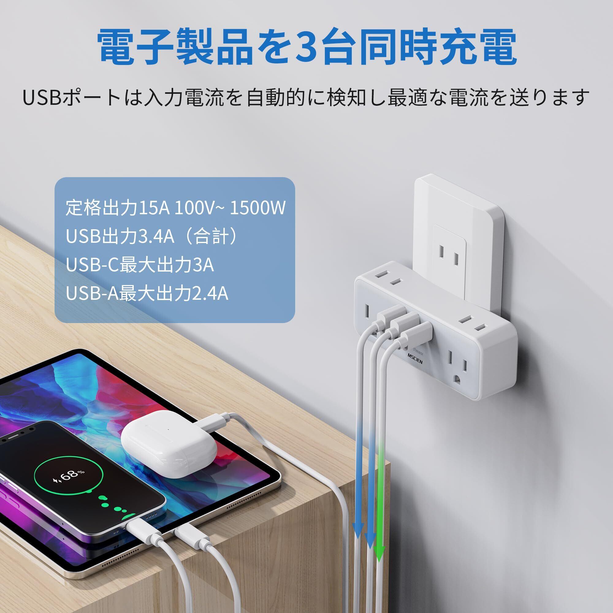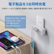 「コンセント usb」各USBポート合計3.4A出力。type-aポート単独で使用する場合、最大出力2.4A。type-cポート単独で使用する場合、最大出力3A。USBポートには接続機器の端末を自動で判別し、スマホとカメラなど、それぞれの機器に合わせた最適な出力で充電します。