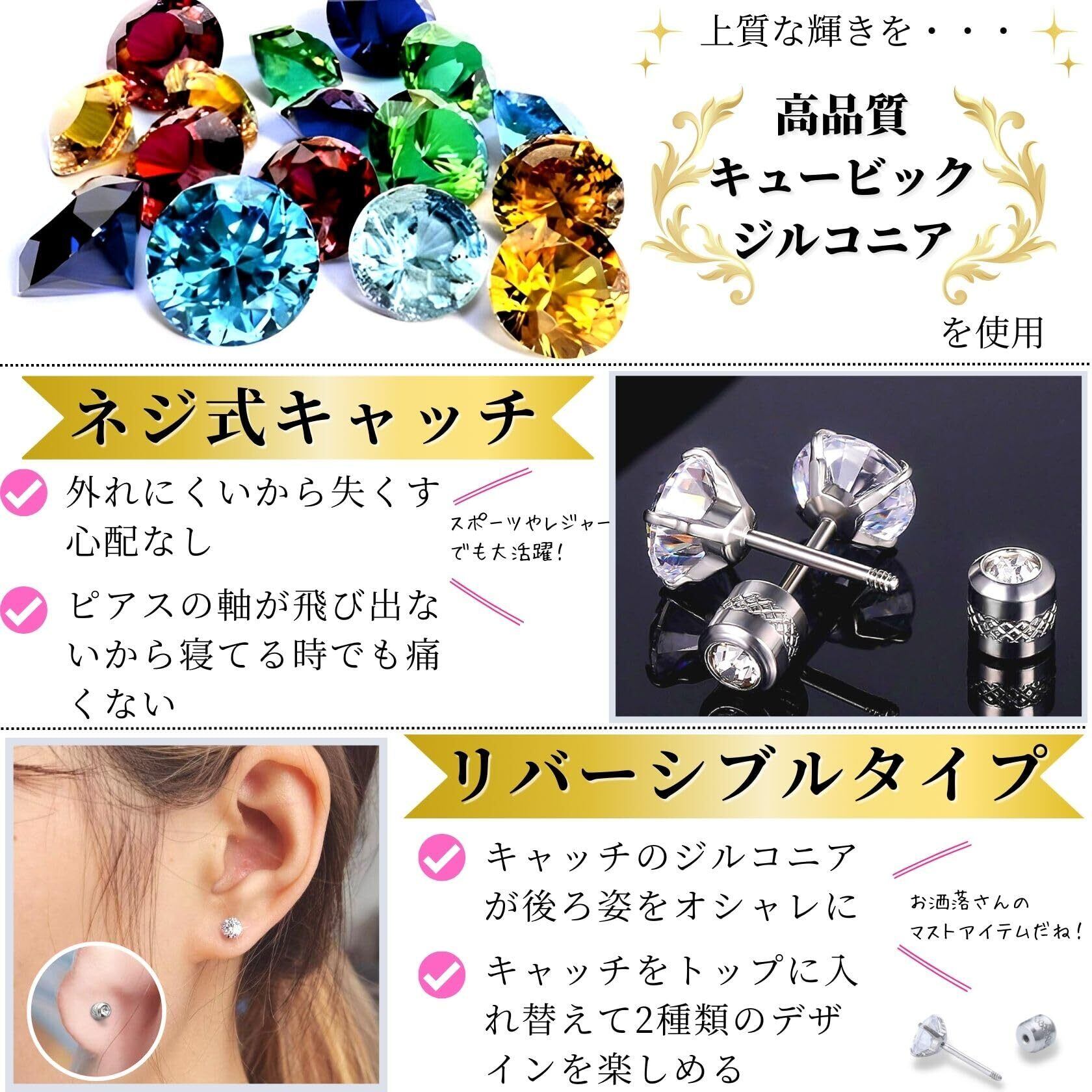 【落ちない、引っかからないネジ式キャッチ】ネジ式ピアスの特徴は、ポストが外に出ないため着替えの時の引っかかりや、寝返りを打つ時に耳裏に刺さることがないので安心してご使用いただけます。キャッチはネジ式でしっかり固定されるので、安心してつけっぱなしでき、セカンドピアスにもおすすめです。