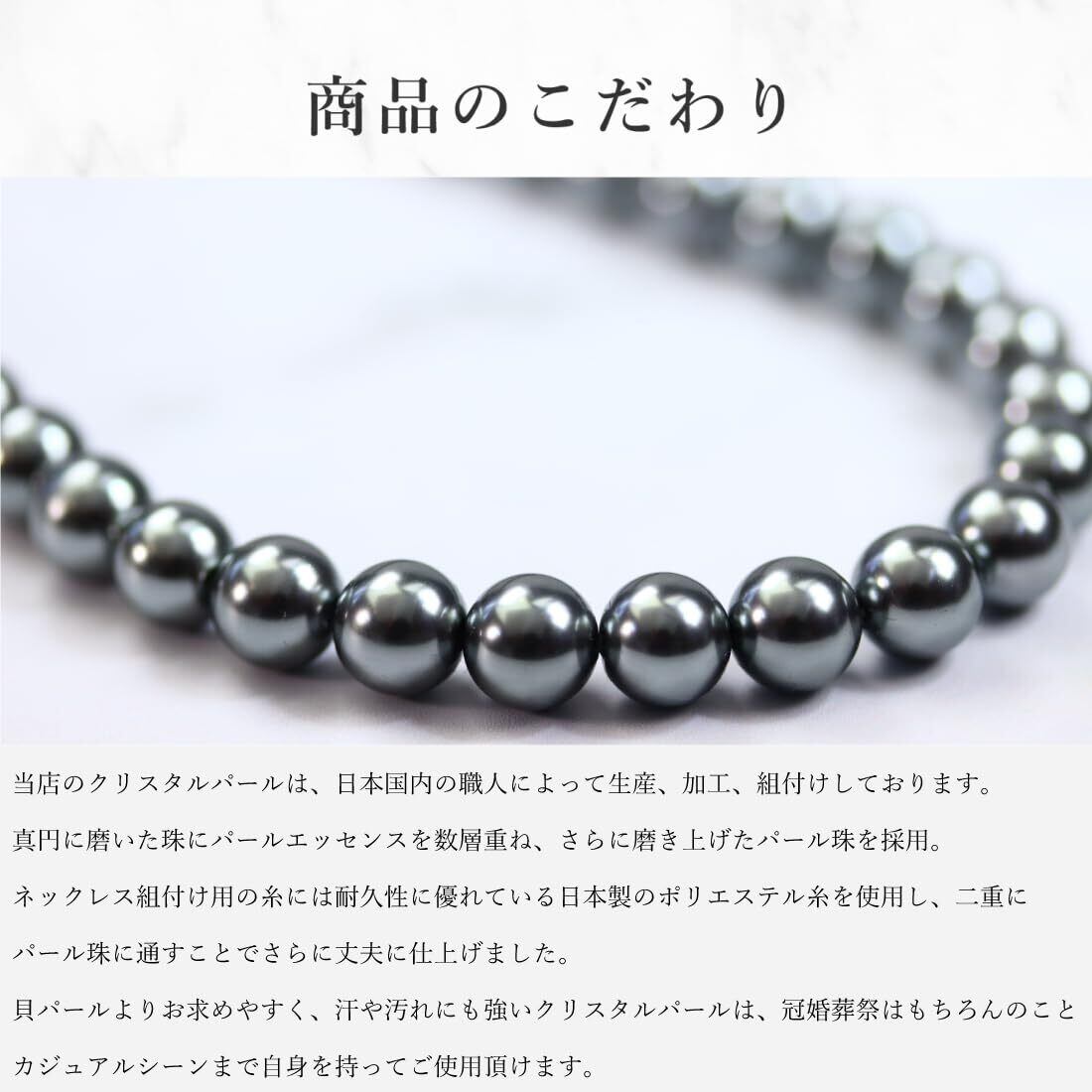 【高品質の日本製!】素材、金具、組み付けともに国内の職人が自社手作業で生産しております。カラーはシルバーブラック(慶事用などのフォーマルシーンにおすすめ)です。また、耐久性に優れている日本製の糸を使用しています。糸をパール珠に二重にして通しておりますので、更に丈夫に仕上がりました。永くご愛用いただけるアイテムです。
