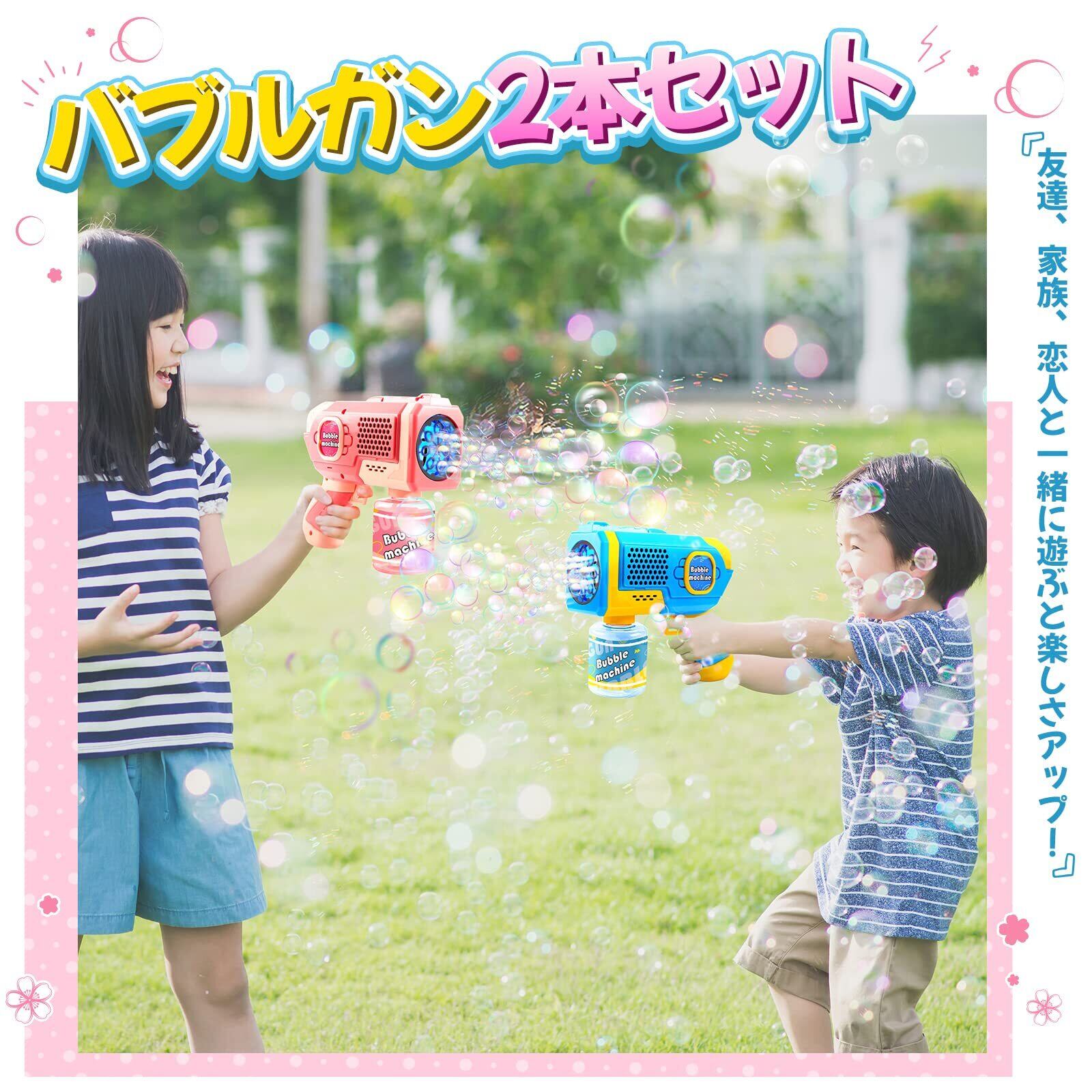 ○【2個セット】バブルガンが2個セットになっているので、1人で遊ぶより、2人でたくさんシャボン玉を発射した方がさらに楽しく遊べるはずです。