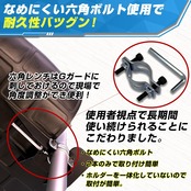 飛散防護カバー 広い防護面積で草刈りの飛散物を効果的にシャットアウト。作業者を守ります。 角を丸くしてあり、使用時に地面にひっかかりにくい形状 取付ボルトに六角を採用。ねじがなめにくく長期使用が可能。