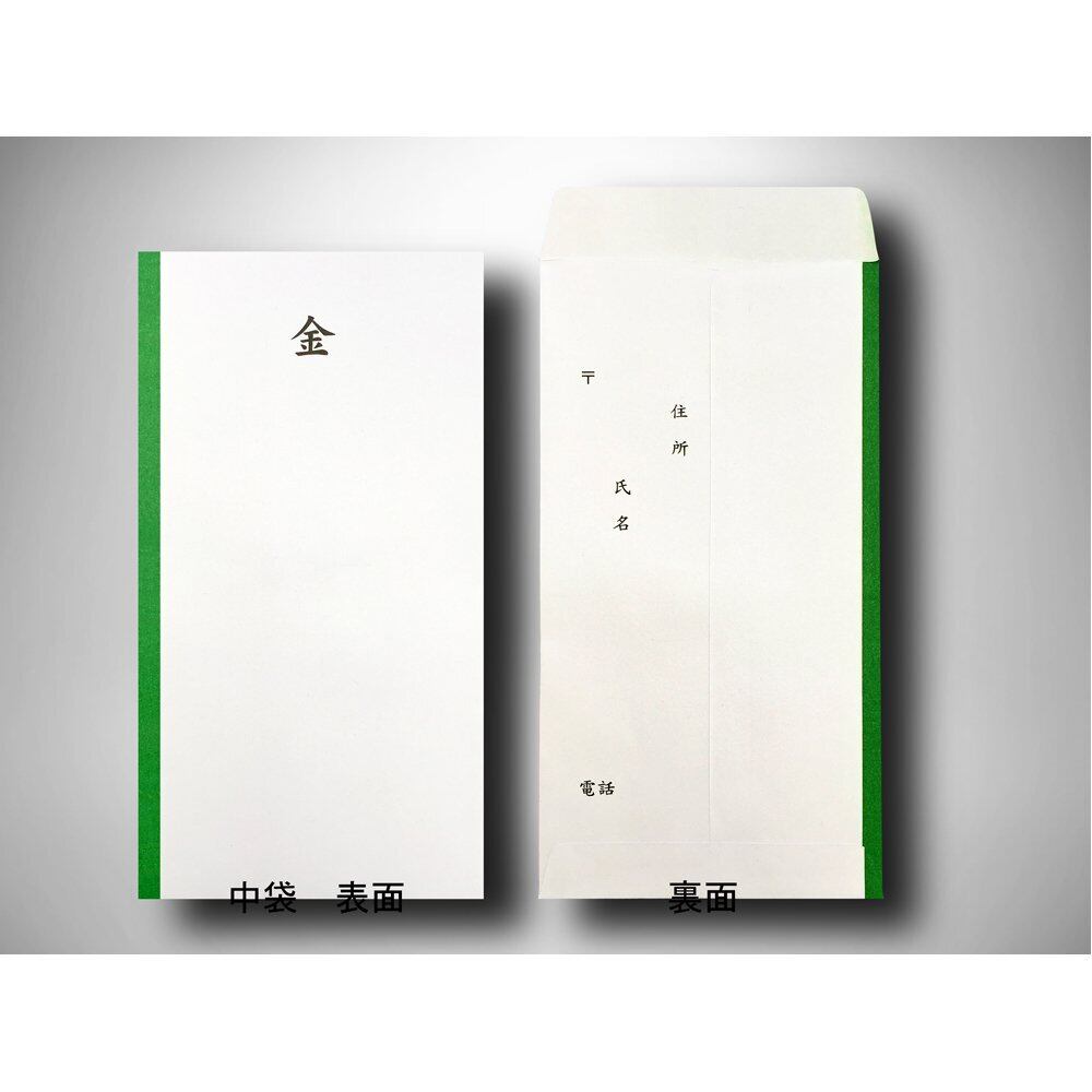 中袋の書き方一例としましては縦書きで表面に金額(金○千円)、裏面に住所・氏名等を記入。本体裏面折り返し部分の重なり方に要注意。中袋封入後、下部に上部が重なる。