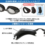 【着け心地にこだわったシリコーン素材】 フェイスパッドにシリコーンを使用することで、肌あたりが良く水中でも必要以上に押しつけを感じないゴーグルに仕上げています。ストラップ(ゴム)部分にもシリコーンを使用することで、装着しやすさにもこだわりました。