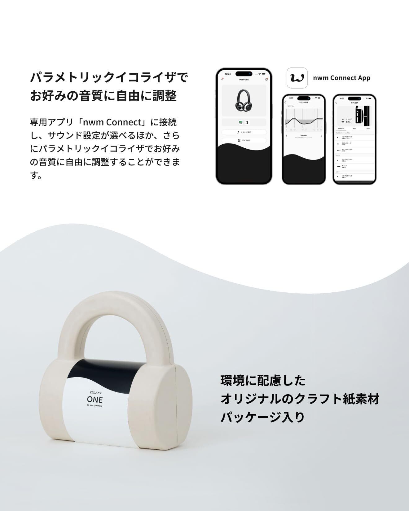 音を心ゆくまで楽しめる、ユーティリティな機能。|360 Reality Audio、次世代Bluetooth規格LE Audio/Auracast、マルチポイントにも対応し、専用アプリ「nwm Connect」 でパラメトリックイコライザ調整も可能。接続方法はBluetoothによるワイヤレス接続、付属のUSB Type-CケーブルによるUSBオーディオ接続が可能です。最大再生時間 約20時間。5分の充電で1時間のリスニングが可能です。