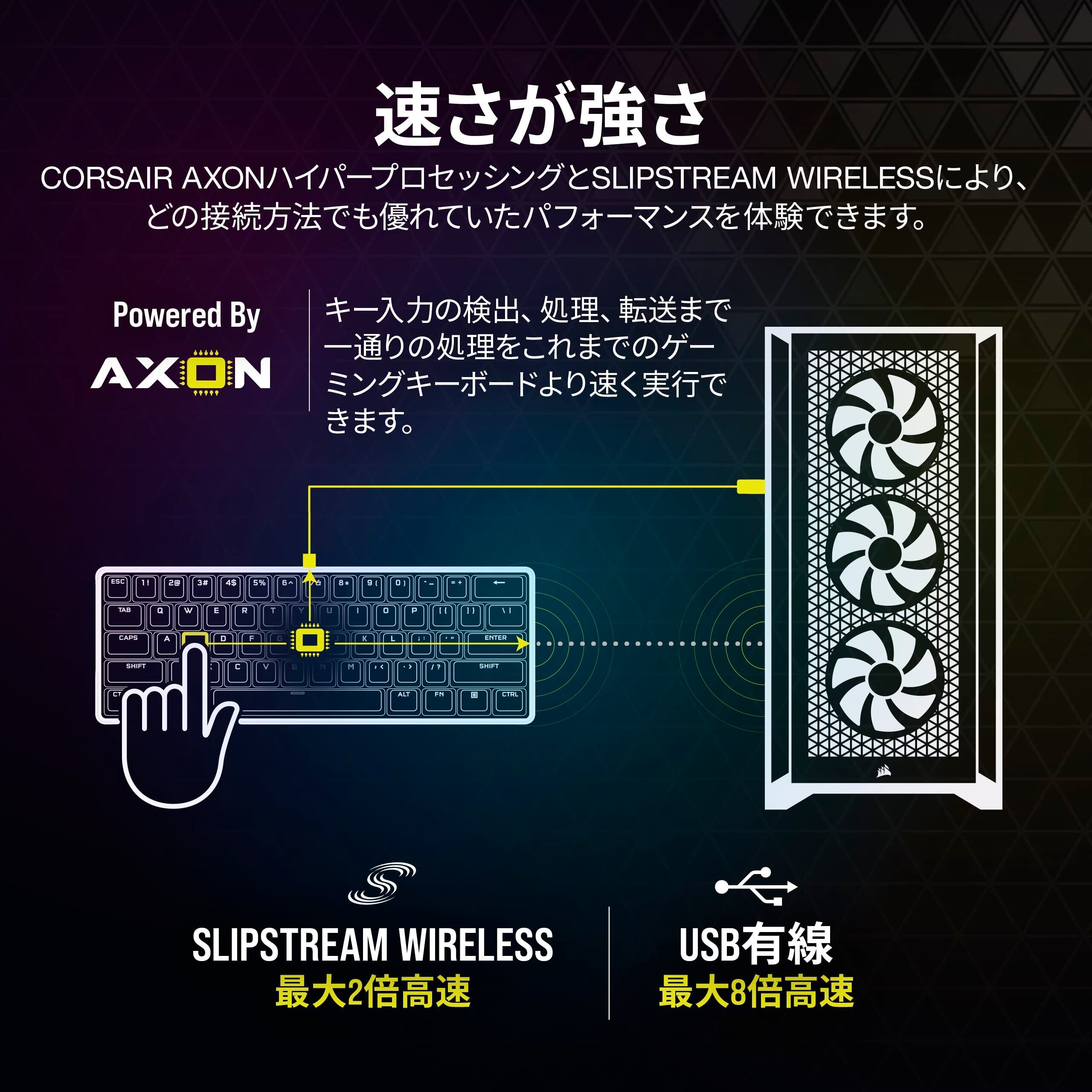 CORSAIR K70 RGB PRO MINI RGBはCherry MX SPEED RGB Silverキースイッチを採用したゲーミングキーボード。机の上の限りあるスペースを有効活用できる60%のコンパクトサイズを採用しました。CORSAIR AXON ハイパープロセッシングテクノロジーによる優れた応答性を備え、フルNキーロールオーバーと100%アンチゴースティングによる正確な入力が可能です。