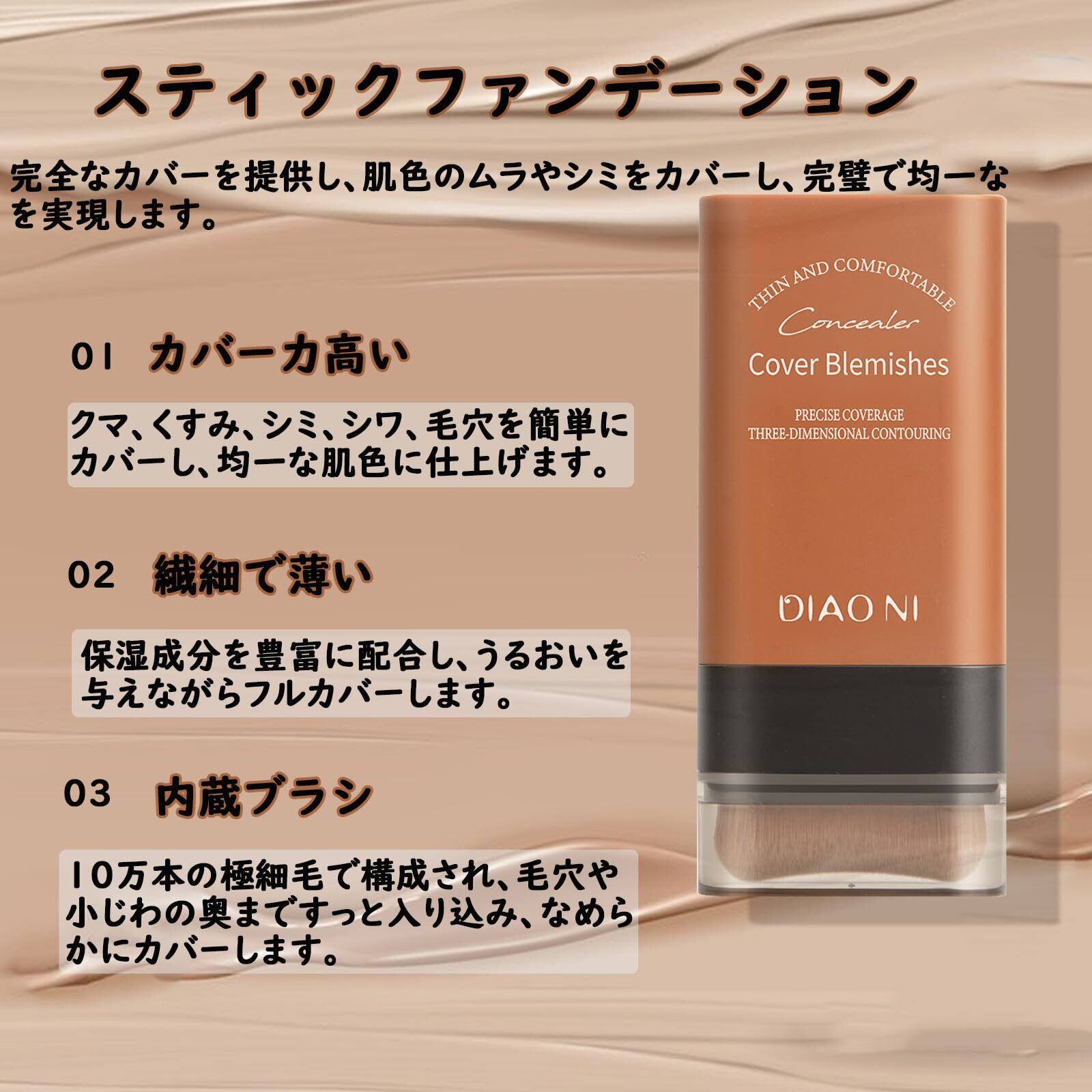 【カバー力高い&くずれにくい】 クマ、シミ、キズ、シワ、毛穴までカバーしてくれます。このファンデーションはカバー力高く、瞬時になめらかな下地に仕上がります。12時間保湿効果を発揮しながら、肌を柔らかく、なめらかに保ちます。カバーファンデーションとブラシが一体型で、たくさんの化粧直し道具をバッグの中に入れてしまうお悩みを解決してくれます!