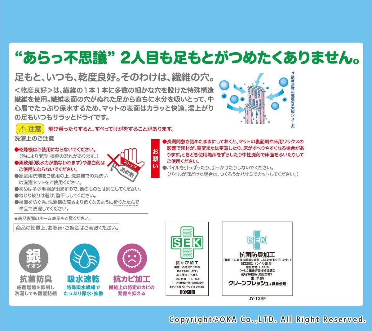 ●湿気によりカビが繁殖しやすいバスマットに、カビ菌の発育を抑える加工をすることでカビが繁殖しにくく、清潔に安心してご使用頂ける