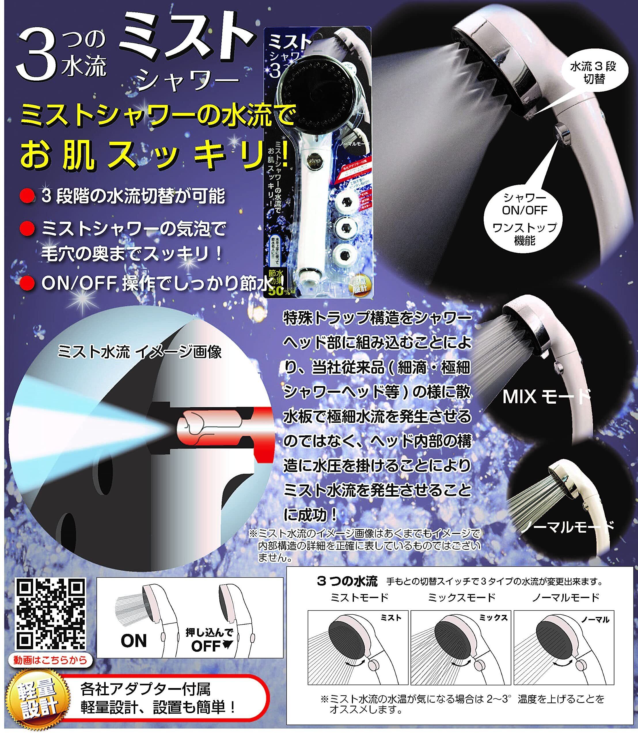 3つの水流切り替えが可能な【ミストシャワーヘッド】が登場!