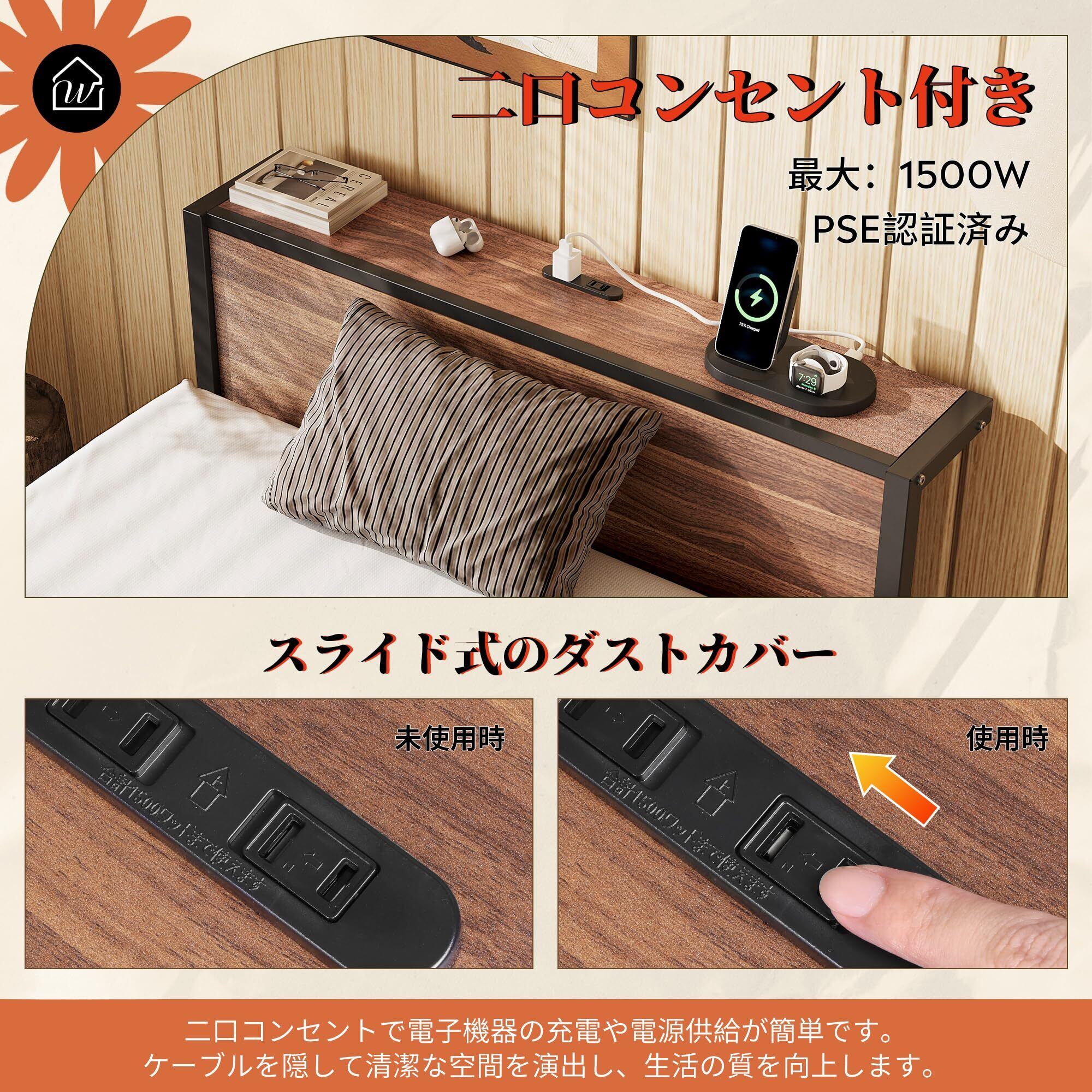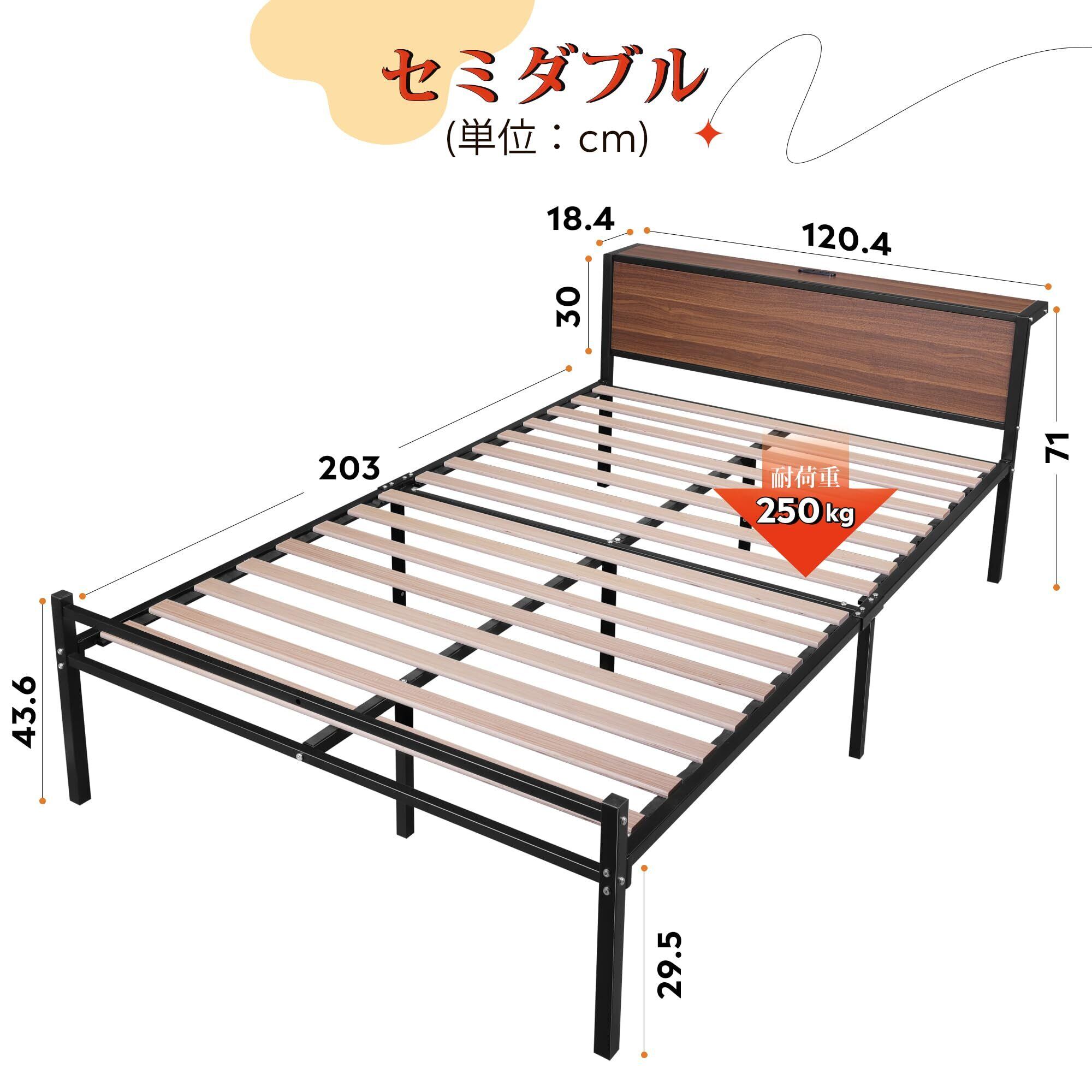 WLIVE ベッドフレーム 宮棚付き 2口コンセント すのこベッド セミダブル スチールベッド 収納付き ベッド下収納 カビ防止 耐荷重250kg ハイタイプ ベッドフレーム単品 ウォールナット×ブラック
